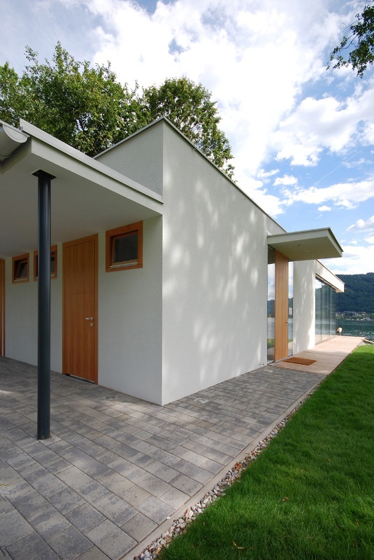 Für die Lagerräume, welche als Aufbewahrungsort für z.B. Schwimmtiere und Liegestühle genutzt werden, wird ein Platz an der südlichen Grenze zum Nachbarn vorgeschlagen. So wird eine räumliche Trennung des Grundstückes durch das Gebäude verhindert und die Durchsicht zum Seeufer gewährleistet (Text: Architekten)