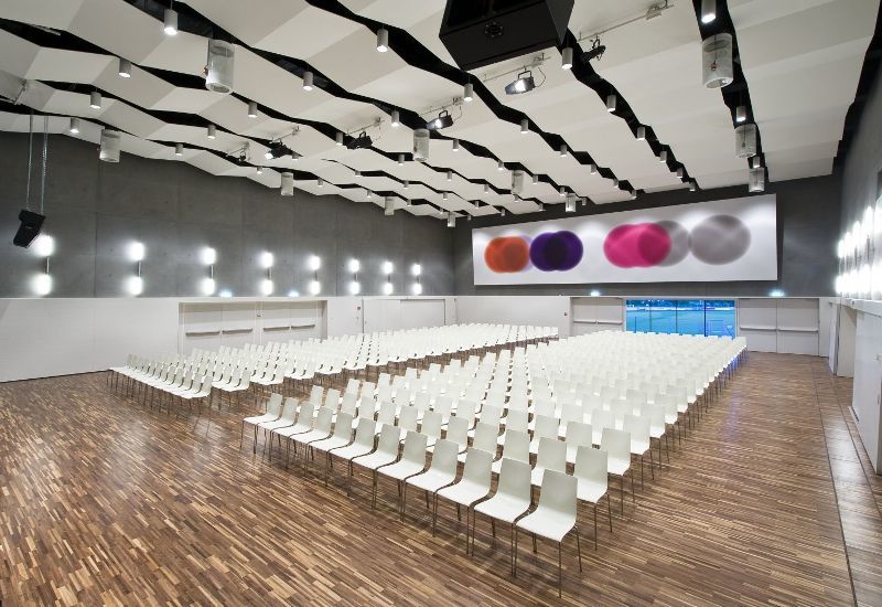 Der Saal ist mit seinen neun Metern Höhe, 18 Metern Breite und 30 Metern Länge so dimensioniert, dass sitzend 600 und stehend maximal 1000 Personen Platz finden. Es gibt eine präzise gesetzte Verglasung in der Sockelzone, die auch abgedunkelt werden kann. Eine Verkleidung mit Akustikpaneelen im Sockelbereich (2,50 Meter hoch) und die wundervolle Faltung der Akustikdecke aus weißem Gipskarton – Origami-Kunst im besten Wortsinn, jede Faltung berechnet vom Akustiker Karl Bernd Quiring – liefern beste schalltechnische Voraussetzungen. Auch das große, den Raum dominierende, von den Architekten zusammen mit dem Grafikdesigner Dieter Wolf entwickelte Bild – es zeigt kreisrunde Farbfelder, die man als abstrahierte Blumen interpretieren könnte – hat mit der Raumakustik zu tun. Dahinter verbergen sich schallschluckende Kastenelemente. Und natürlich sind die Längswände des Saals nicht einfach senkrecht, sondern ganz leicht – nur um drei Grad – nach außen gekippt.