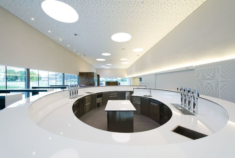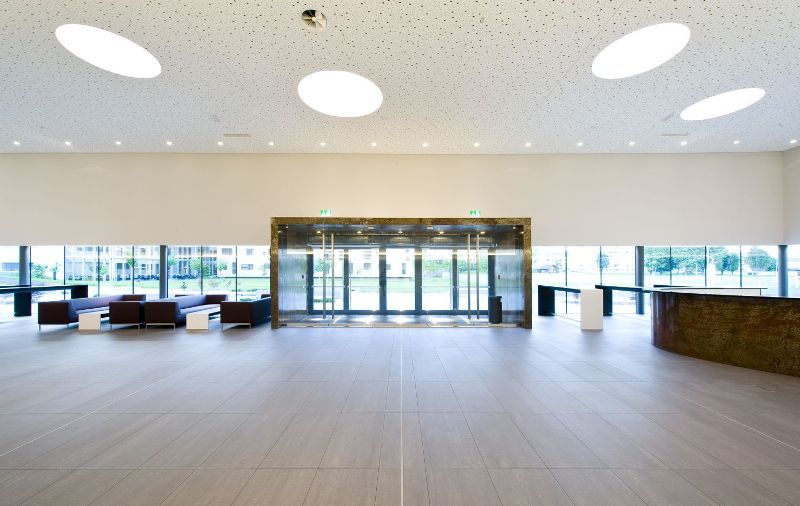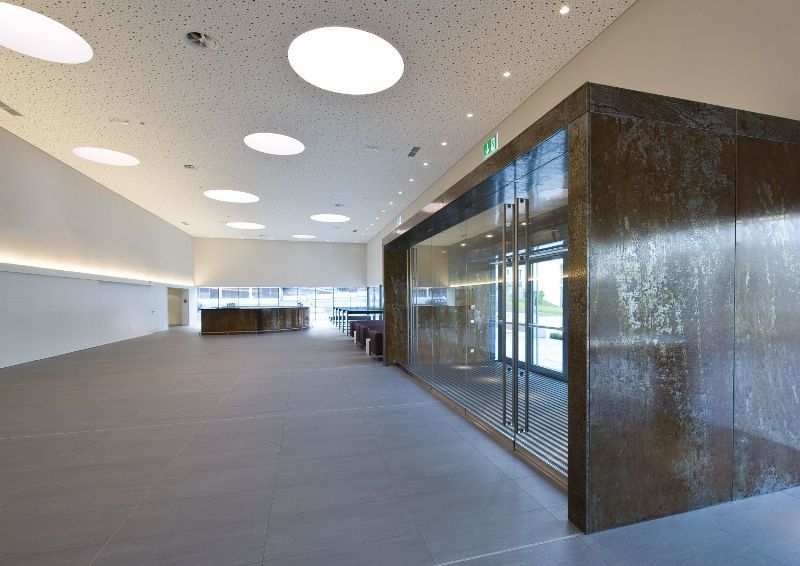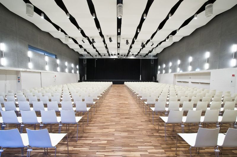 Man kommt, wie gesagt, über einen sehr attraktiven Vorplatz zum Gebäude. Es gibt ganz schlichte Sitzbänke, abends von unten effektvoll beleuchtet. Das Open-Air-Forum für gesellschaftliche Auftritte wurde also gekonnt bewältigt. Wenn man eintritt, ist es nicht viel anders. Links und rechts vom Windfang setzen zwei variabel – etwa als Empfangspult und als Bar – nutzbare Implantate in Schneckenform einen Akzent, 13 kreisrunde, unterschiedlich dimensionierte Lichtkuppeln ermöglichen bei Tag und Nacht attraktive Lichteffekte. Hier, im Foyer, ist die Decke abgehängt, die Raumhöhe beträgt nur sechs Meter. Aber das ist genau die Differenzierung, die es braucht, um die räumliche Steigerung zum neun Meter hohen Saal erlebbar zu machen.