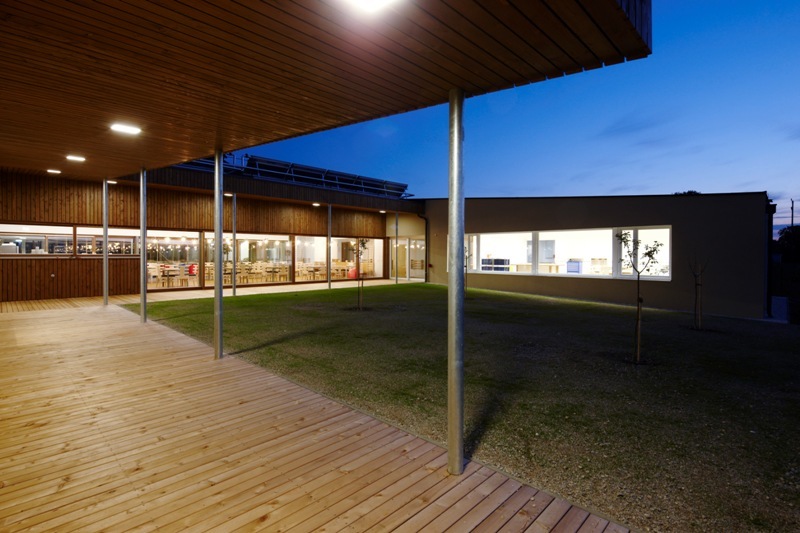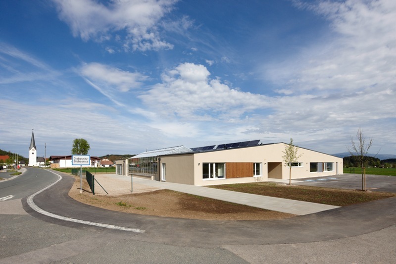 Situiert wurde die Tageswerkstätte gegenüber von Schule und Kindergarten am Rande Globasnitzs. Sie gliedert sich mit Ihren Gruppenräumen, Werkstätten und Ateliers um eine mittlere Zone welche aus mehreren Bereichen besteht.