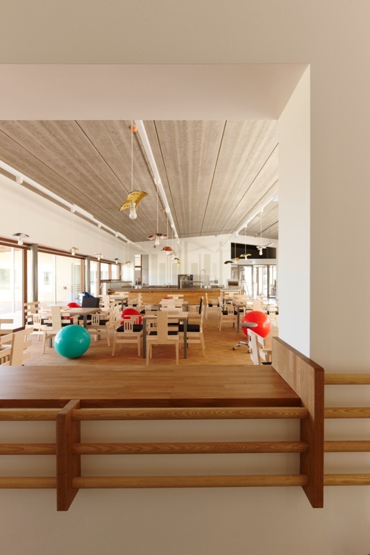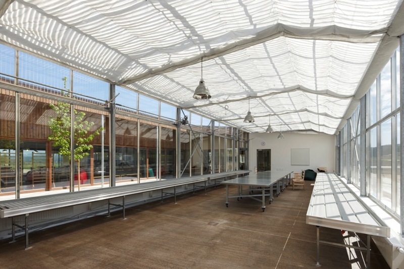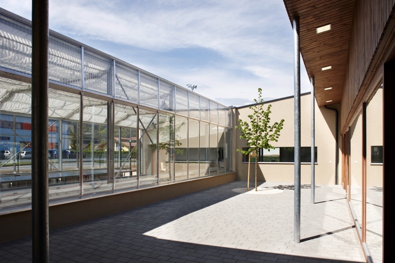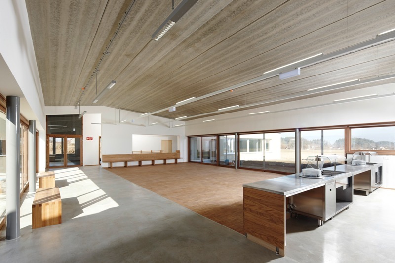 Ein zentraler Saal dient als Treffpunktion und Ort für Kommunikation. An ihn angrenzend im Norden ist ein Hof ausgebildet welcher vor allem im Sommer Schatten spendet. Der angelegte Obstgarten reicht ins Gebäude. Vom Saal blickt man in den angelegten Obstgarten und die dahinter liegenden Felder und Berge. Zur Straße im Süden situiert ist das Glashaus platziert. Dies ist Produktionsort als auch auf die Werkstätte aufmerksam machender Schauraum. Zwischen Saal und Glashaus ist ein kleiner intimer Hof zwischengeschalten. Ein windgeschützter Ort der Ruhe aber auch Arbeitsbereich für sonnige Tage in der Übergangszeit.