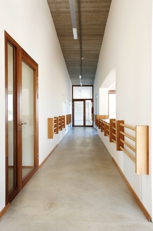 Erschließung und Gänge sind großräumig angelegt, da schwerstbehinderte Menschen immer unterschiedliche Hilfsmittel benötigen, die Raum beanspruchen: Rollstuhl, Gehhilfe, mobile Sprossenwand, Rollator oder Gehbock, uvm. Gleichzeitig dienen die Gänge auch als Treffpunkte und öffentliche Orte, wo sich Kommunikation entwickeln darf, soll und kann.