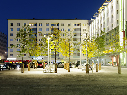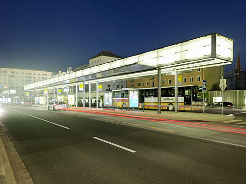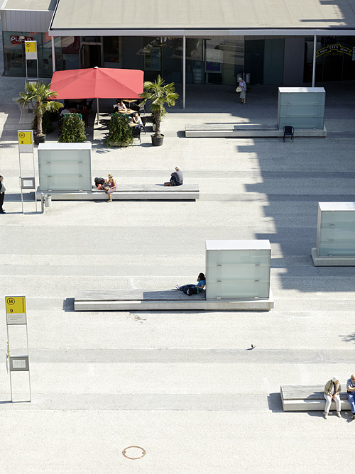 Ein augenfälliges Streifenmuster spannt sich als verbindender Teppich zwischen den platzbildenden Fassaden auf. Der Allgemeinverkehr wird in möglichst knappen Asphaltbändern kanalisiert. Pro Platzhälfte bildet je ein zweiseitiger Bussteig für Stadt- bzw. Regionalbusse die Trennlinie zwischen fliessendem Verkehr und Platzfläche.Die Perrondächer und das über den Ein- und Ausfahrten der Tiefgarage sitzende Radparkhaus sind zugleich überdimensionale Leuchtkörper. Die beiden Platzhälften unterscheiden sich: die westliche ist pflanzenlos durch eine Wasserfläche und rhythmisch angeordnete Sitz- Leuchtelemente gegliedert, bei der östlichen, die zur Bahnhofstrasse mit einem Flugdach begrenzt wird, durchdringen Bäume die urbane Haut des Platzes; Leuchten projizieren das Schattenspiel der Blätter auf die Platzoberfläche.