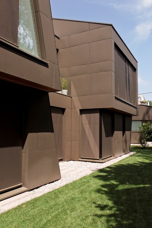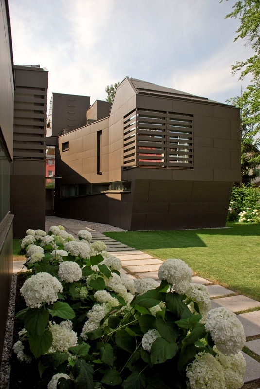 Die dunklen Fassadenplatten nehmen die Fernwirkung des Gebäudes wesentlich zurück, wodurch sich die Erscheinung aus grösserer Entfernung und vom See aus betrachtet dezent im Hintergrund hält. (Text: Architekten)