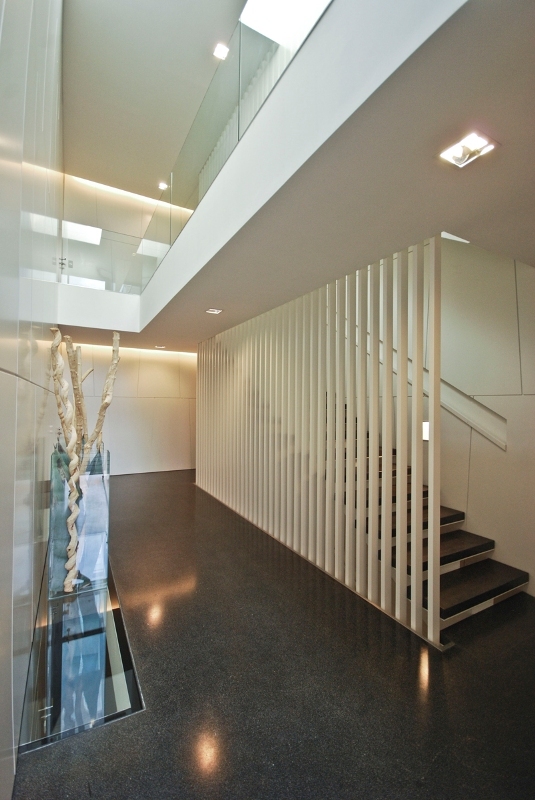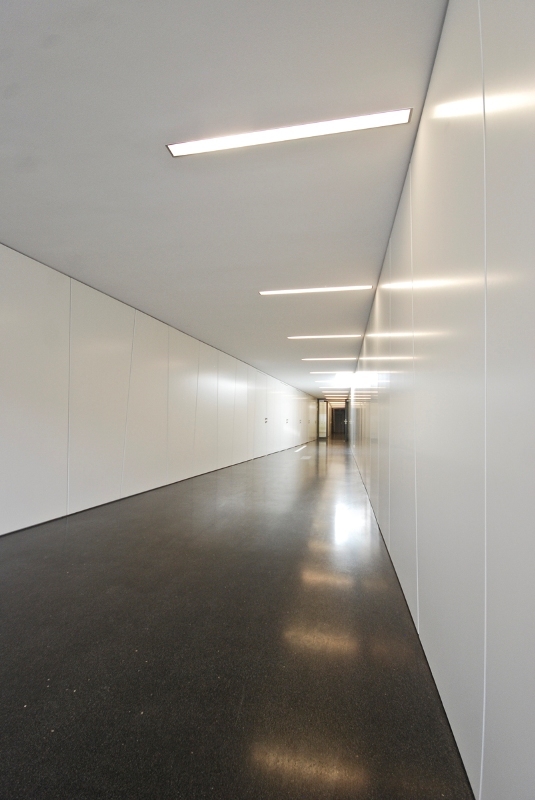 Die Erschliessung erfolgt nördlich zentral über einen tiefen Einschnitt in eine grosszügige Halle im Kern des Gebäudes.
