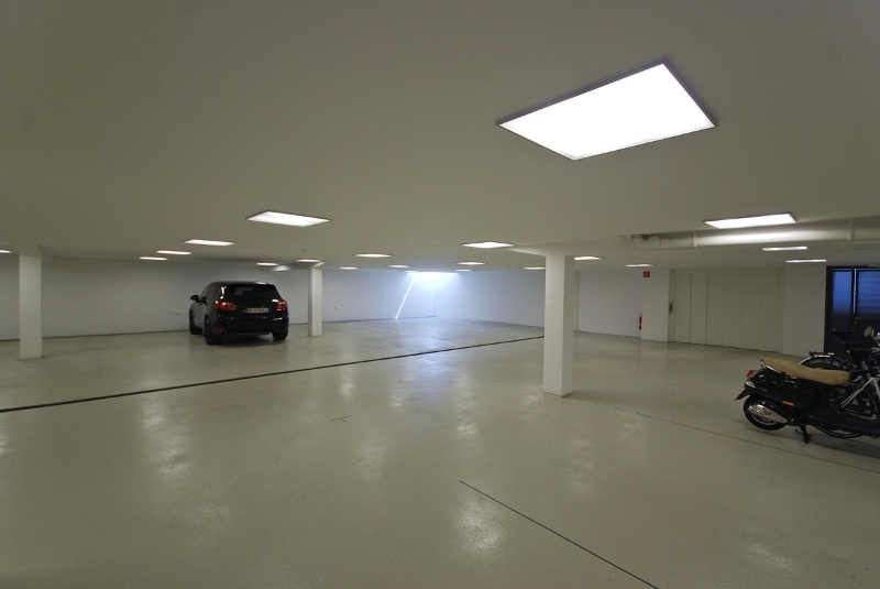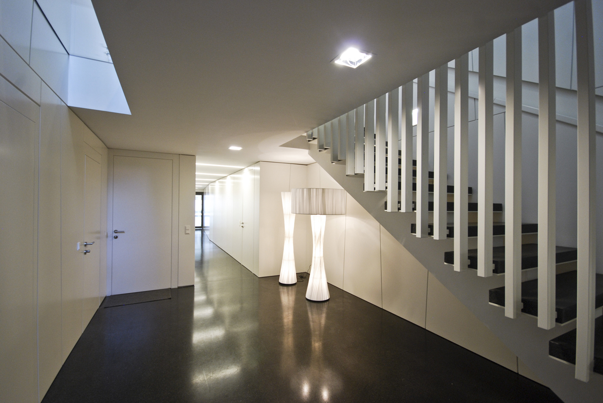 Die EG Wohnungen gelangen direkt über ihr eigenes Grün zum Seebereich. Alle anderen Wohnungen über das Untergeschoss. Auch hier wurde das Thema Seeblick thematisiert. Der Tunnel verbreitert sich Richtung See um einem „Kellereindruck“ entgegenzuwirken. Westseitig, verborgen hinter der Wandvertäfelung befinden sich noch Abstellboxen für Bade- und Wassersportutensilien.