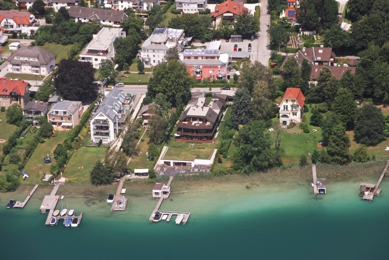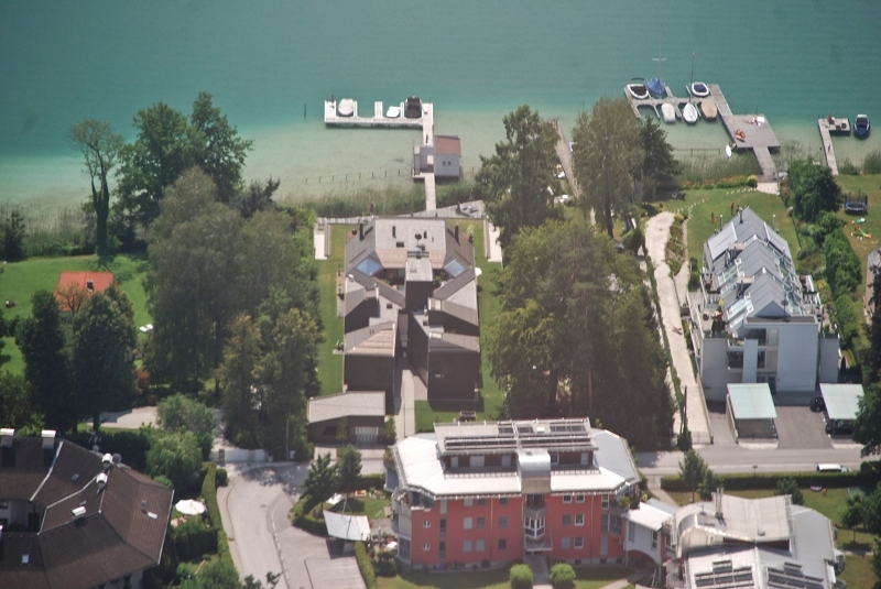 Durch einen Rücksprung zwischen Wohn- und Schlafbereich werden breite Aussichtsfronten zum See vom Wohn-Essraum bzw. vom Masterbedroom aus möglich. Auch die nördlichen Räume haben Seeblick, Ebenso ist von der Tiefgarage der Blick zum See möglich.
