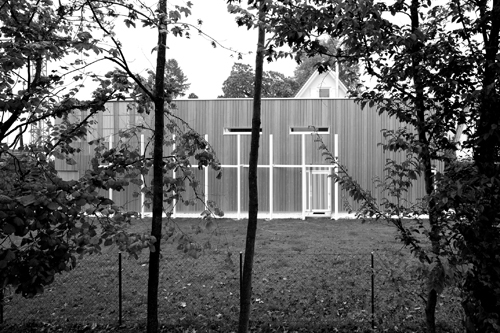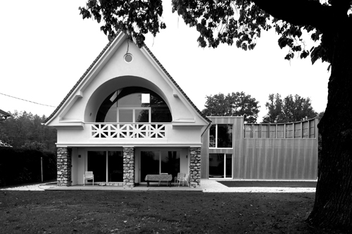 Da der Zubau nunmehr funktionale Räume zu beherbergen hat, stellt er sich in die zweite Reihe. Das Stiegenhaus bildet den Verbindungsknoten. Nördlich des Grundstücks führen mehrere Verkehrswege in relativ knappem Abstand vorbei, wobei die Rad und Fahrwege nur ein Einsichtproblem darstellen, die Bahn und die dahinter parallel führende Wörthersee-Norduferstrasse jedoch zusätzlich ein Schallproblem aufwerfen. Das Zuhaus stellt sich also als langgestreckte zweigeschossige Rückwand schützend hinter den Bestand (Backboard). Um die Körperhaftigkeit zurückzudrängen – eine Wand ist eben flach – werden die Ecken über die Diagonalen viertelkreisförmig gerundet. Im Grundriss entsteht eine schiffsrumpfartige Form, beim Rundumgehen vermisst man die Seitenwände, der Baukörper wird zur Wand.