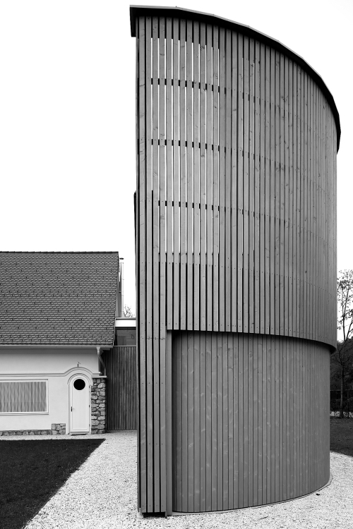 Der Neubau besteht aus einem Betonkern (Schallschutz!) einer äußeren Haut aus vertikalen Holzlatten, welche die Rundung aufnehmen können und einer inneren Haut aus Birkensperrholzplatten. (Text: Architekten)