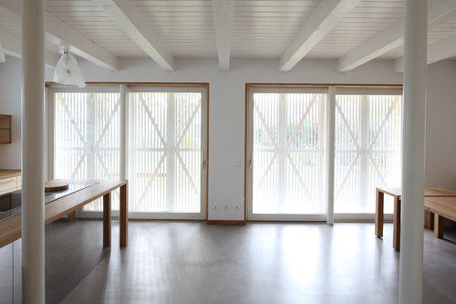 Der Charme des Baumgartnerhäuschens mit seiner plastischen, loggienartigen Giebelfront wird als Raum fürs Wohnen gewählt, schon weil es die beste Aussicht am Grundstück besetzt. Es wird komplett entkernt, so dass nur noch ein großer Raum im Erdgeschoss für Kochen, Essen und Gäste und einer neuen Fensterfront zum See, sowie ein Raum im Obergeschoss, der bis in den Dachraum reicht für Wohnen übrig bleiben.
