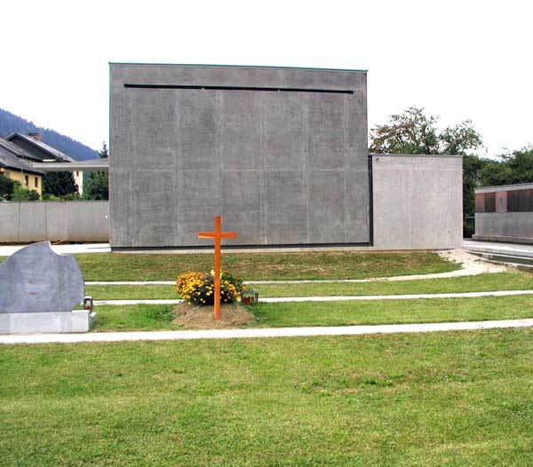 Die Aufbahrungshalle aus eingefärbtem Sichtbeton ist nach außen hin als kubische und geschlossene Form (in Form eines Sarkophags) konzipiert, schmale Schlitze entlang der Längswände lassen den schweren „Deckel“ jedoch schweben. Stirnseitig wird die Betonwand (bis zur Hälfte der gesamten Höhe) nach oben geklappt und bildet den Eingang – der Eindruck, das massive Vordach, exakt in der Größe der Türöffnung, könnte jederzeit das Grab für immer schließen, wurde bewusst inszeniert.