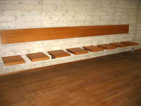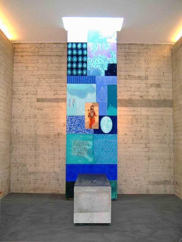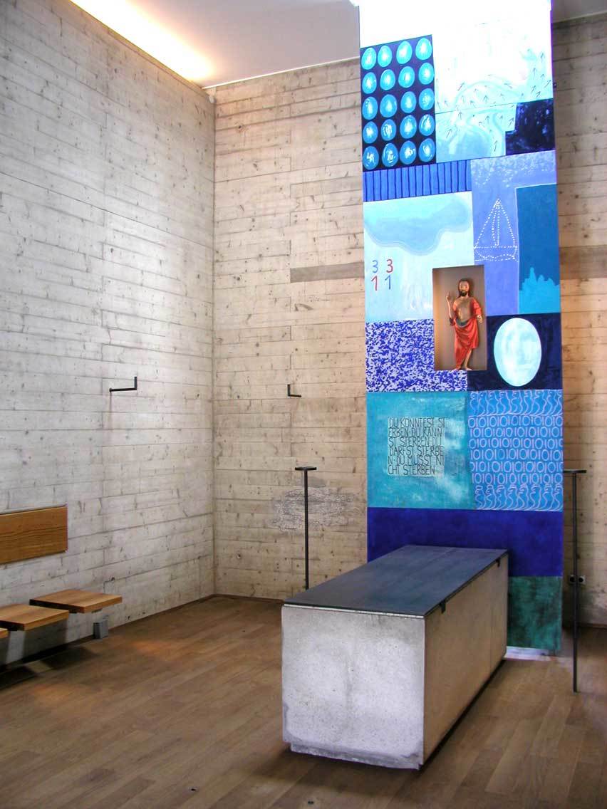 Mit dem Betreten der Halle wird die ganze Aufmerksamkeit auf das zentrale Geschehen einer Bestattung, nämlich die Realität des Todes in Verbindung mit dem Glauben der Auferstehung gelenkt. Ganz im Gegensatz zur geschlossenen äußeren Form wird hier der Raum nach oben hin aufgebrochen und erhellt – vom dunklen Boden und der Stahlplatte der Aufbahrung, über immer heller werdende Betonwände, bis zur Decke, die über deckenbündige Lichtschlitze der Seitenwände natürlich belichtet wird (hier ist auch ein Großteil der künstlichen Belichtung unsichtbar situiert). Auf den Sargtisch inmitten des Raumes fällt durch ein Oberlicht in der Decke ein mächtiger und gerichteter Lichtstrahl. Hinter dem Sargtisch erstreckt sich eine Bildwand vom Boden bis zur Decke, und verschwindet im Schacht des Oberlichtes. Die Symbolik der Bildwandgestaltung von Johanes Zechner, mit einer „schwebenden“ gotischen Holzfigur des auferstandenen Christus im Zentrum, verstärkt den Gedanken der Auferstehung. Mit Rücksicht auf die Buntheit der Kränze und Blumen, die jede Aufbahrung begleiten, wurden die Kranzständer, Weihwasserbecken, Parteständer, Seitenleuchter und Kandelaber in ihrer Form und Material einfach gestaltet: Stahlstangen als veränderbares Boden-Stecksystem. Der Aufbahrungstisch und einzelne Holzsitze, die auskragend entlang der Längswände situiert sind, sind somit das einzige unverrückbare Inventar im sakralen Raum. (Text: Architekten)