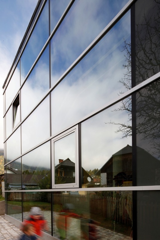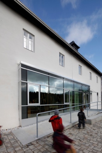 Das Konzept verfolgt den sparsamen und respektvollen Umgang mit dem bestehenden Raum. Die Erfüllung der Funktionen wird ohne Zubau gelöst, damit die Gesamtansicht nicht gestört wird. Der südlich gelegene terrassenartig gegliederte Freiraum/Spielplatz öffnet sich nach Süden mit einer einzigartigen Aussicht, die das Weite unterstreicht - ein Gefühl der Freiheit hervorruft. Diese wird im innenräumlichen Kontext in Szene gesetzt. Das Licht und die Natur werden über großzügige Verglasungen im Gruppenraum selbstverständlich im Inneren des Gebäudes fortgeführt. Besonderer Fokus wird auch auf den schönen und gut erhaltenen alten Stadel am westlich befindlichen Grundstück gelegt.