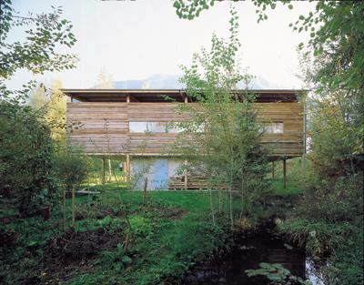 Der hohe Grundwasserstand und die ausgeprägte Geländekante haben den Entwurf maßgeblich bestimmt. Die Lösung ist eine aufgeständerte Konstruktion mit einem kleinen Sockelgeschoss aus Stahlbeton für Lager und Haustechnik . Das eigentliche Wohngeschoss in Holzskelettbauweise ruht auf diesem Sockel und stützt sich auf weitere 12 Säulen aus Lärchenholz. Der umgebende Garten fließt gleichsam unter dem Haus durch. Die Erschließung erfolgt über einen Steg und die südorientierte Loggia.