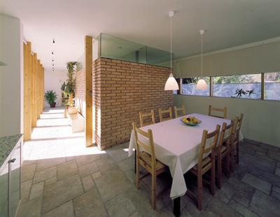 Bei der Gestaltung des Grundrisses wurde versucht, den Wohnbereich großzügig wirken zu lassen und dem kleinen Haus die Enge zu nehmen. Der Garten sollte mit seinen differenzierten Zonen in das Haus hineinwirken. Eine gemauerte Sanitärzelle trennt die Wohnbereiche und dient zusammen mit dem massiven Estrich über der Holzbalkendecke als Wärmespeicher.