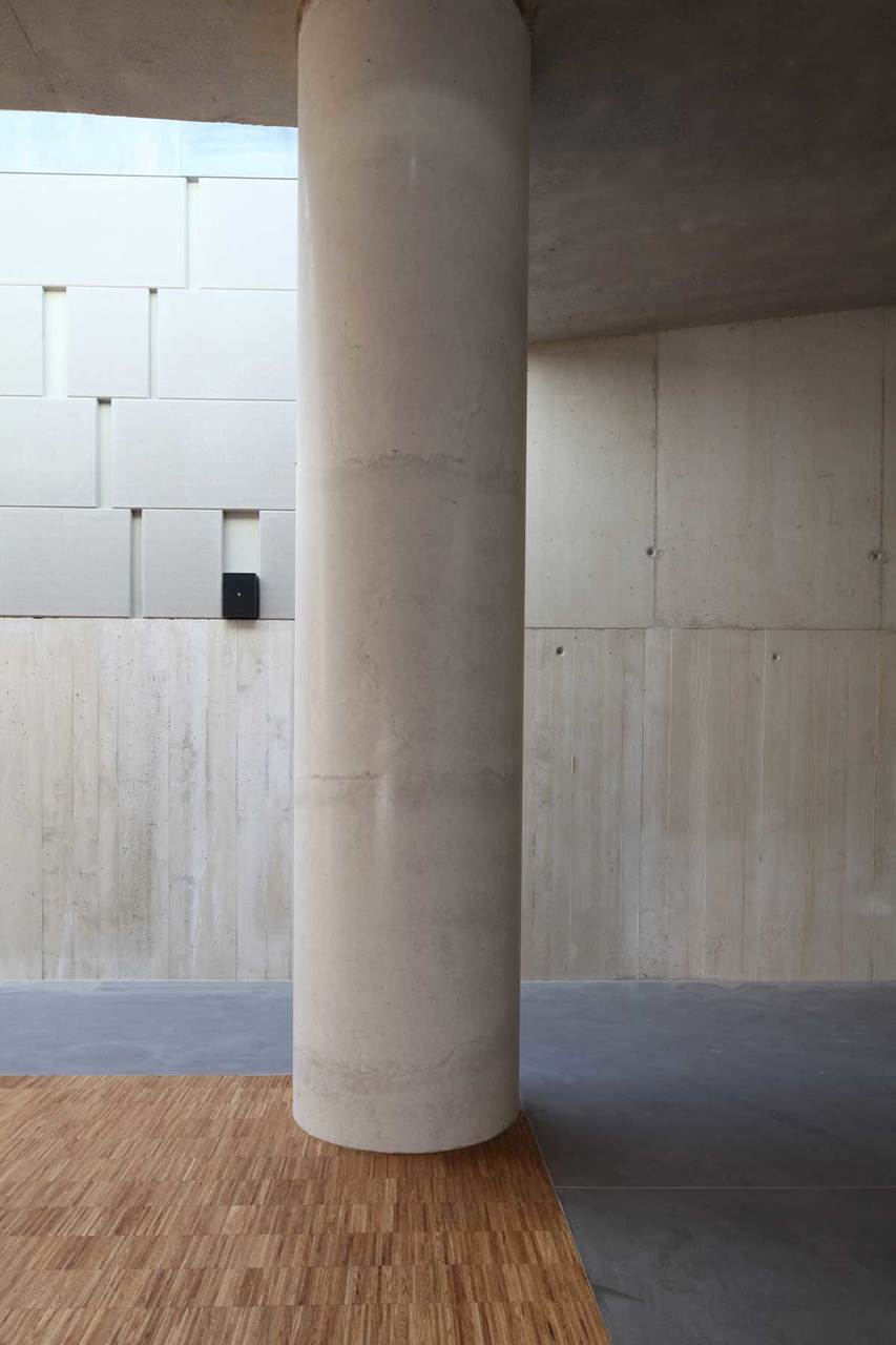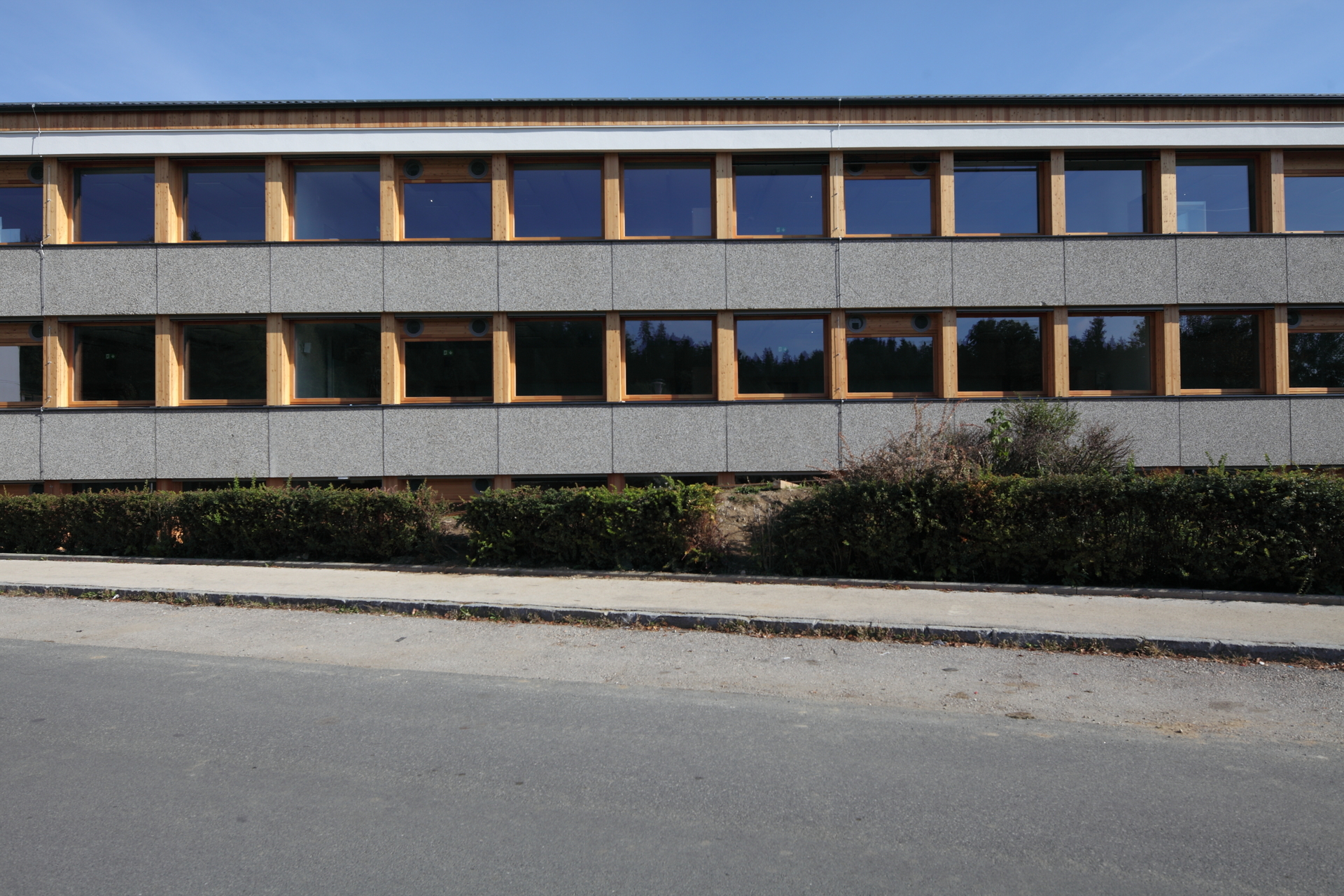 Die prägende Waschbetonfassade des Altbaues wird erhalten. Die Fenster rutschen an die Innenflucht des Mauerwerks, wo sie in der Ebene der Innendämmung zu liegen kommen. Eine tiefe Fensterleibung ist die Folge, welche die Fassade plastischer erscheinen lässt und gleichzeitig einen Teil der Beschattung übernimmt. Zuvor mit Eternit verkleidete Fassadenbereiche erhalten nun einen Vollwärmeschutz. (Text: Architekt:innen)