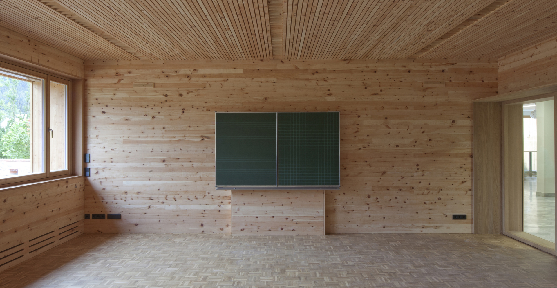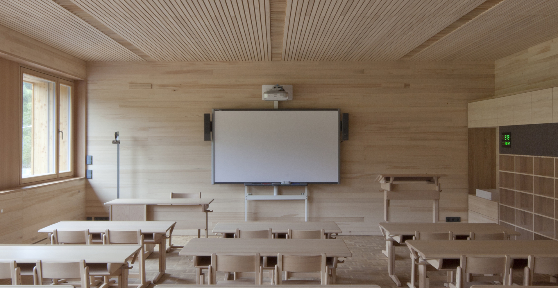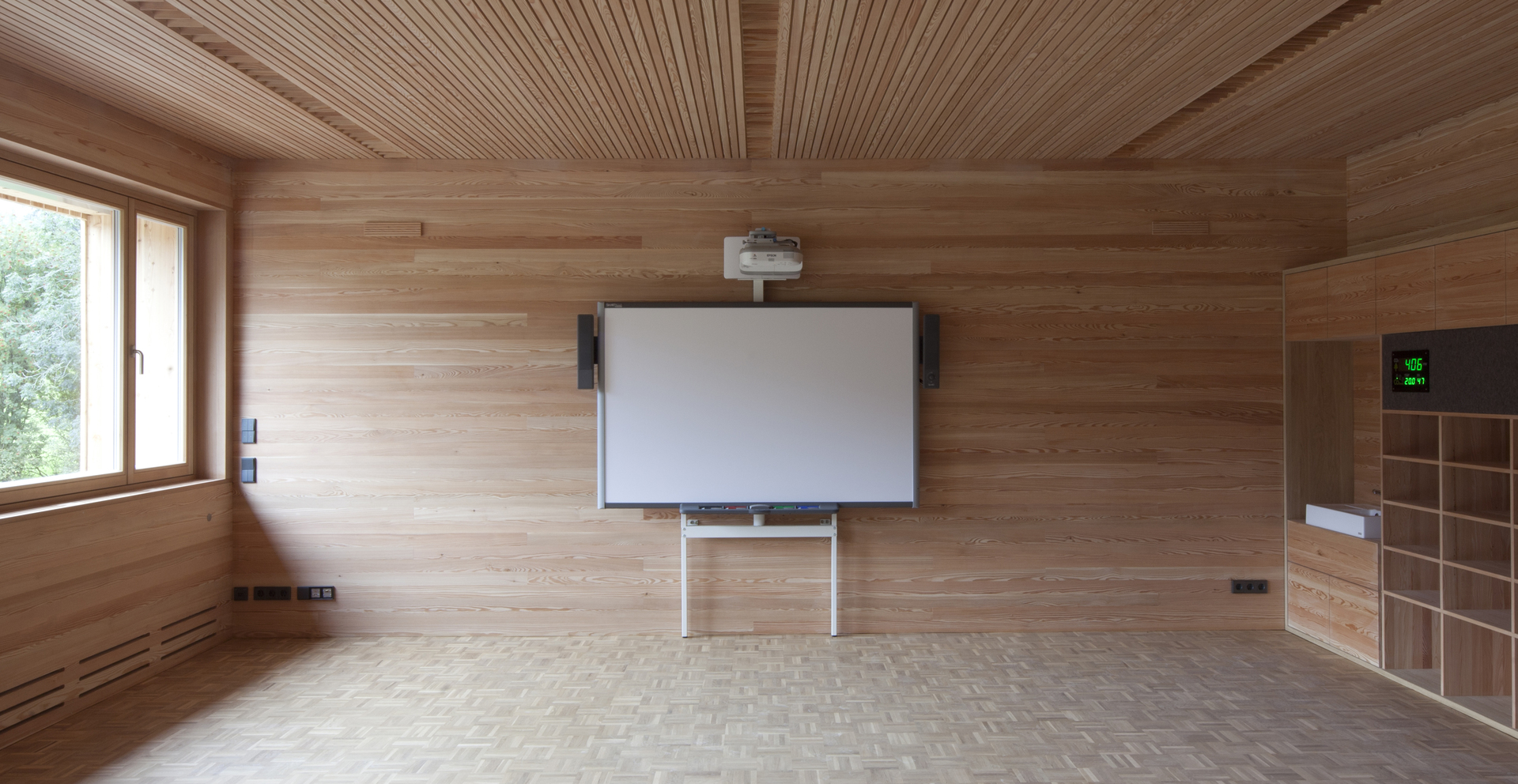 Die thermische Sanierung bestehender Gebäude hat in den letzten Jahren auf Grund der Energiedebatte immer mehr an Bedeutung gewonnen. Die Herausforderung bei diesen Bauaufgaben besteht für uns vor allem in der Schaffung neuer räumlicher Qualitäten – nicht nur durch die Verbesserung der atmosphärischen Eigenschaften durch den Werkstoff Holz - sondern vor allem hinsichtlich optimierter Lichtführungen und Blickbeziehungen.Großzügige Glaselemente verbinden die vier Klassenzimmer mit dem zentralen Aulabereich und schaffen spannende Blickbeziehungen für eine offene Schule und transparenten Unterricht. Die Holzatmosphäre der Klassen strahlt direkt in die Aula und wertet diese ohne größere Eingriffe auf.