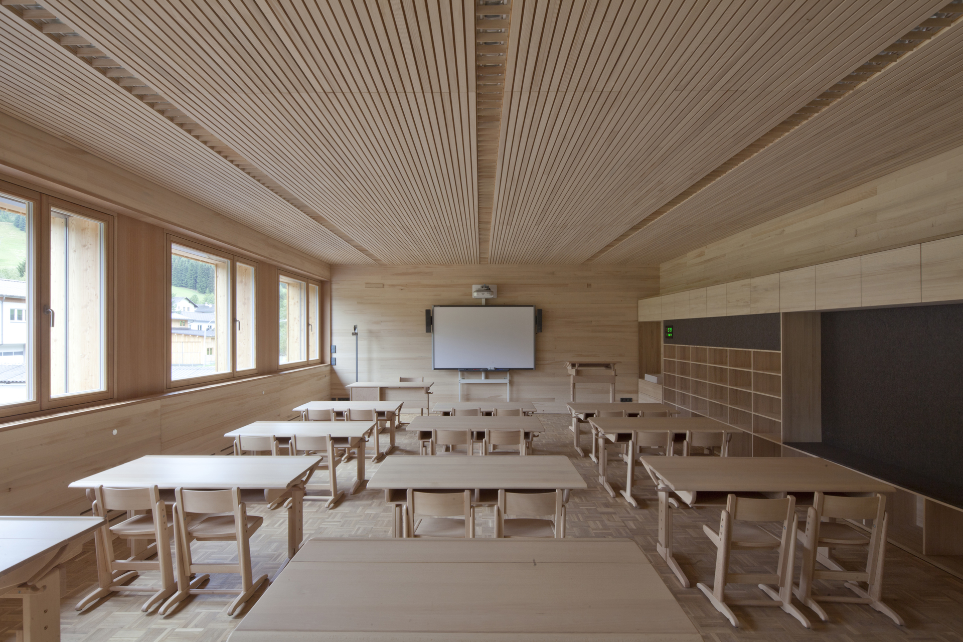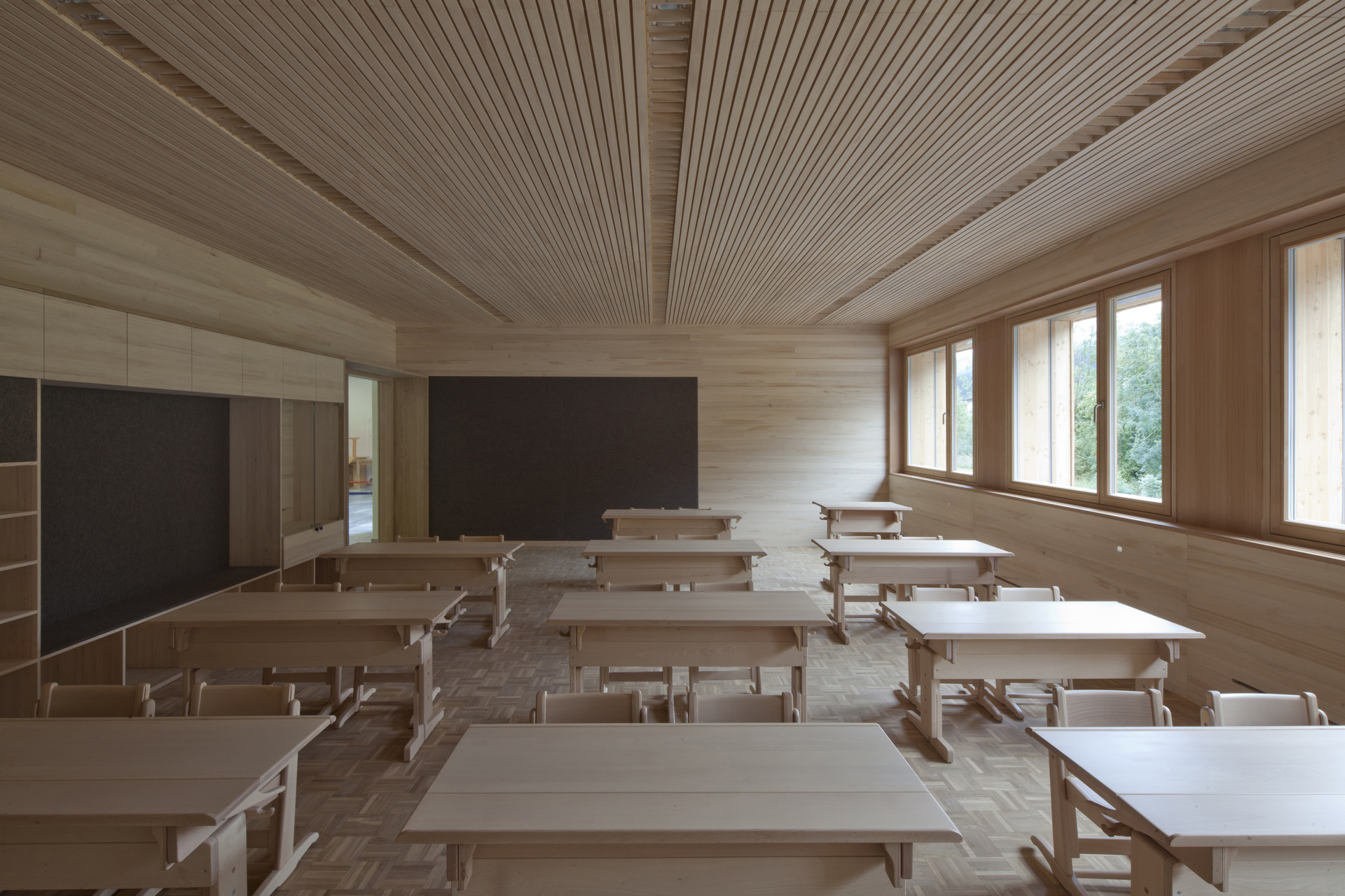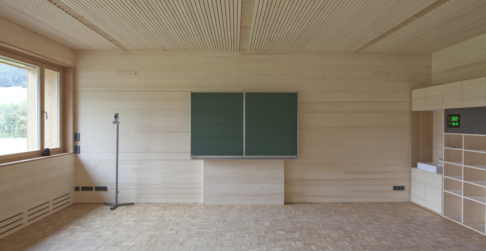 Die thermische Sanierung bestehender Gebäude hat in den letzten Jahren auf Grund der Energiedebatte immer mehr an Bedeutung gewonnen. Die Herausforderung bei diesen Bauaufgaben besteht für uns vor allem in der Schaffung neuer räumlicher Qualitäten – nicht nur durch die Verbesserung der atmosphärischen Eigenschaften durch den Werkstoff Holz - sondern vor allem hinsichtlich optimierter Lichtführungen und Blickbeziehungen.Großzügige Glaselemente verbinden die vier Klassenzimmer mit dem zentralen Aulabereich und schaffen spannende Blickbeziehungen für eine offene Schule und transparenten Unterricht. Die Holzatmosphäre der Klassen strahlt direkt in die Aula und wertet diese ohne größere Eingriffe auf.