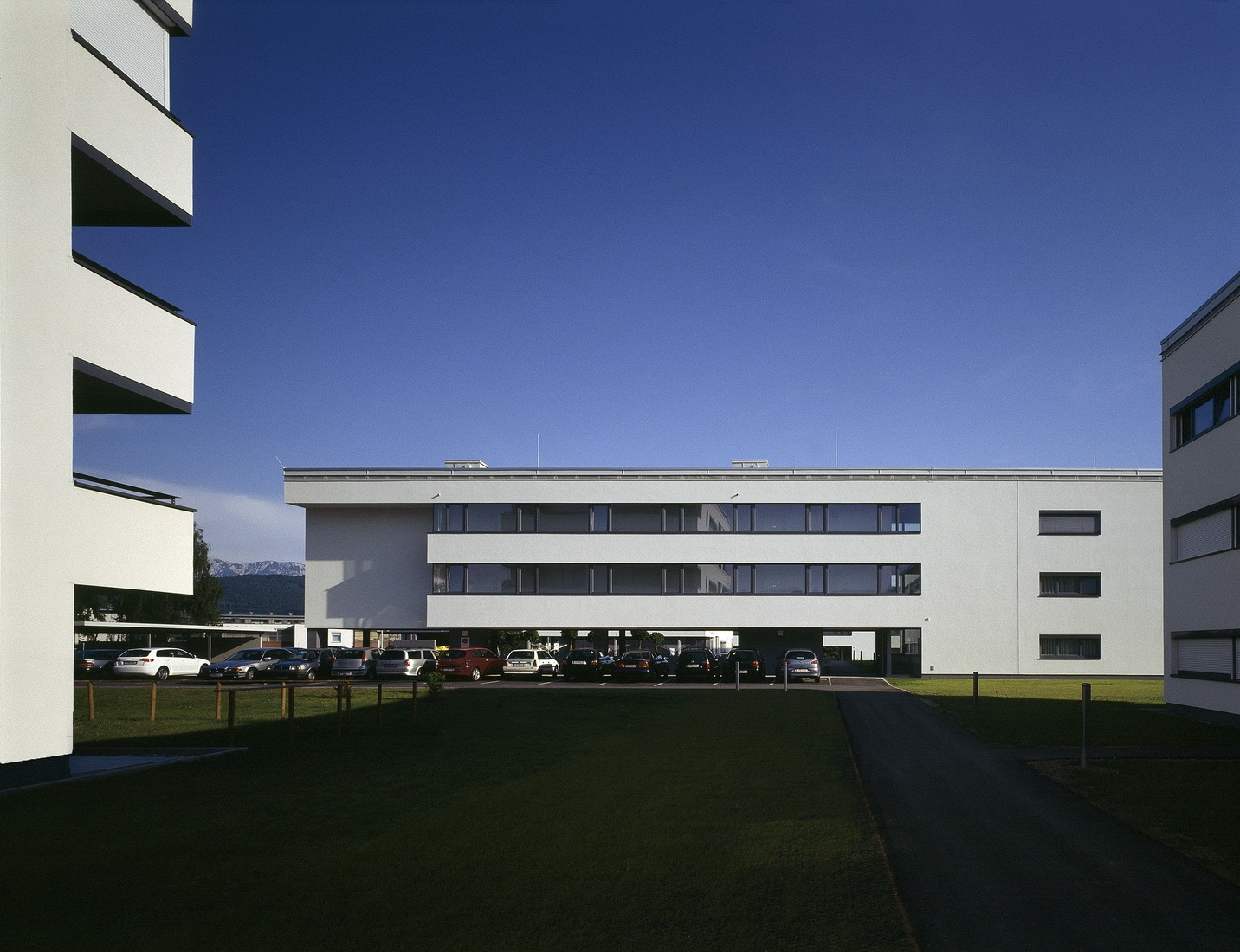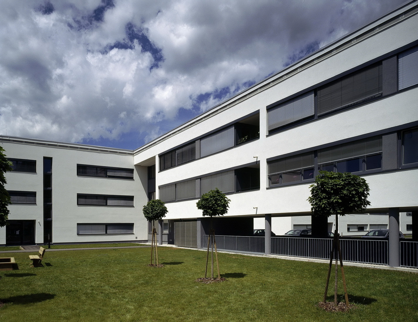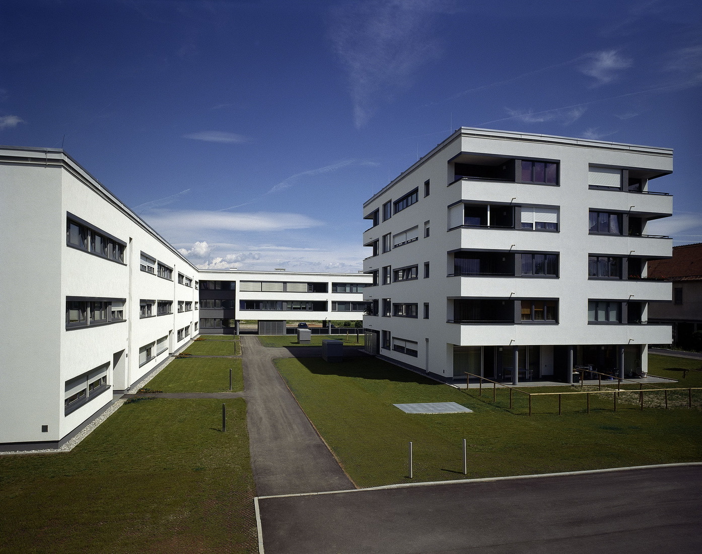 Die Bebauung des Areals ist durch eine klare Struktur und Zonierung des Außenraumes gekennzeichnet. Die Anordnung und Gliederung der Baukörper reagiert präzise auf den Ort und sein Umfeld. Auf die im Westen gelegene Bahnstrecke wird mit einer speziellen dreihüftigen Typologie geantwortet. 3 Zonen charakterisieren dabei den Grundriss: Die Aufenthaltsräume Richtung Bahn, eine inselförmig angeordnete Sanitär- und Nebenraumzone, sowie der Schlafraumbereich, der zum Hof hin orientiert ist. Die fünfgeschossigen Punkthäuser partizipieren am großzügigen ostseitigen Grünraum und gewähren schöne Ausblicke Richtung Süden. Die erdgeschossigen Wohneinheiten verfügen über Privatgärten und nahezu alle Wohneinheiten sind mit Loggien ausgebildet. (Text: Architekt)