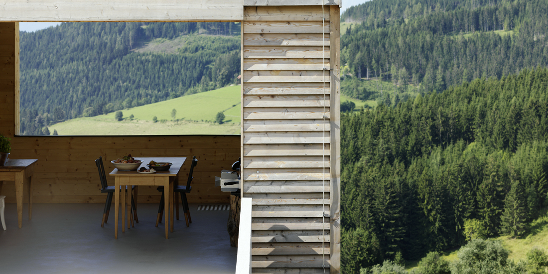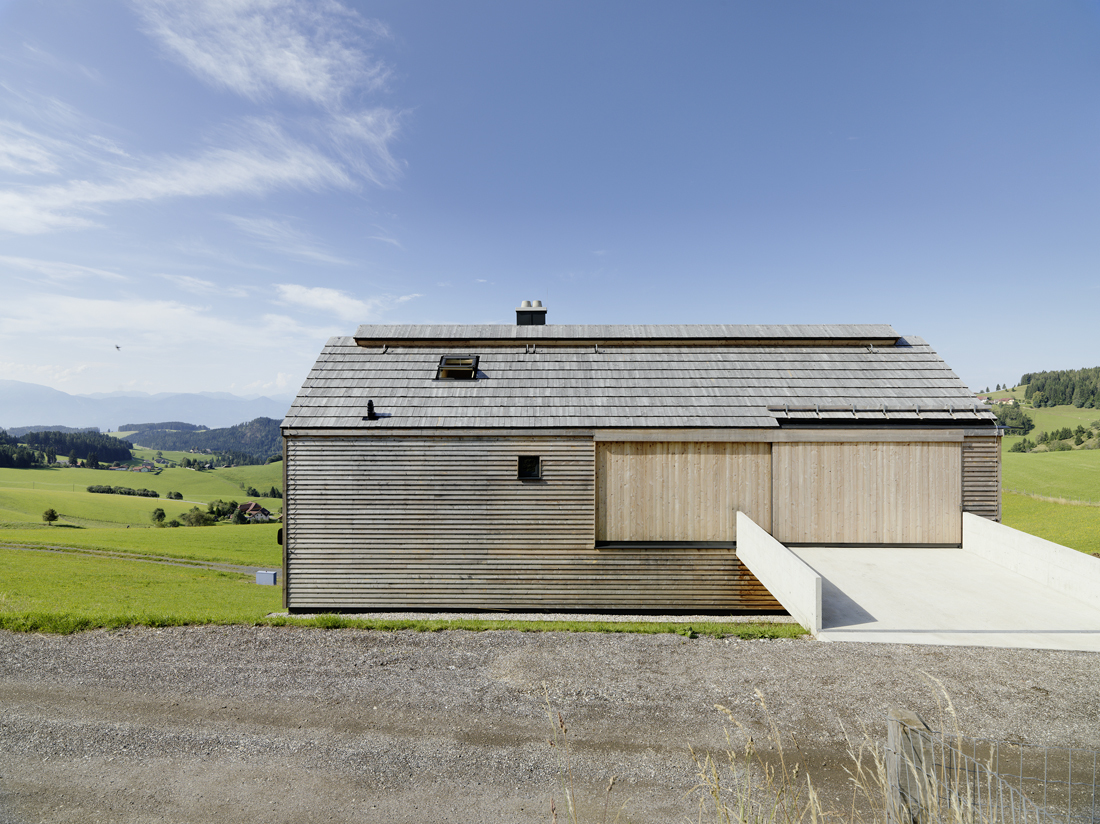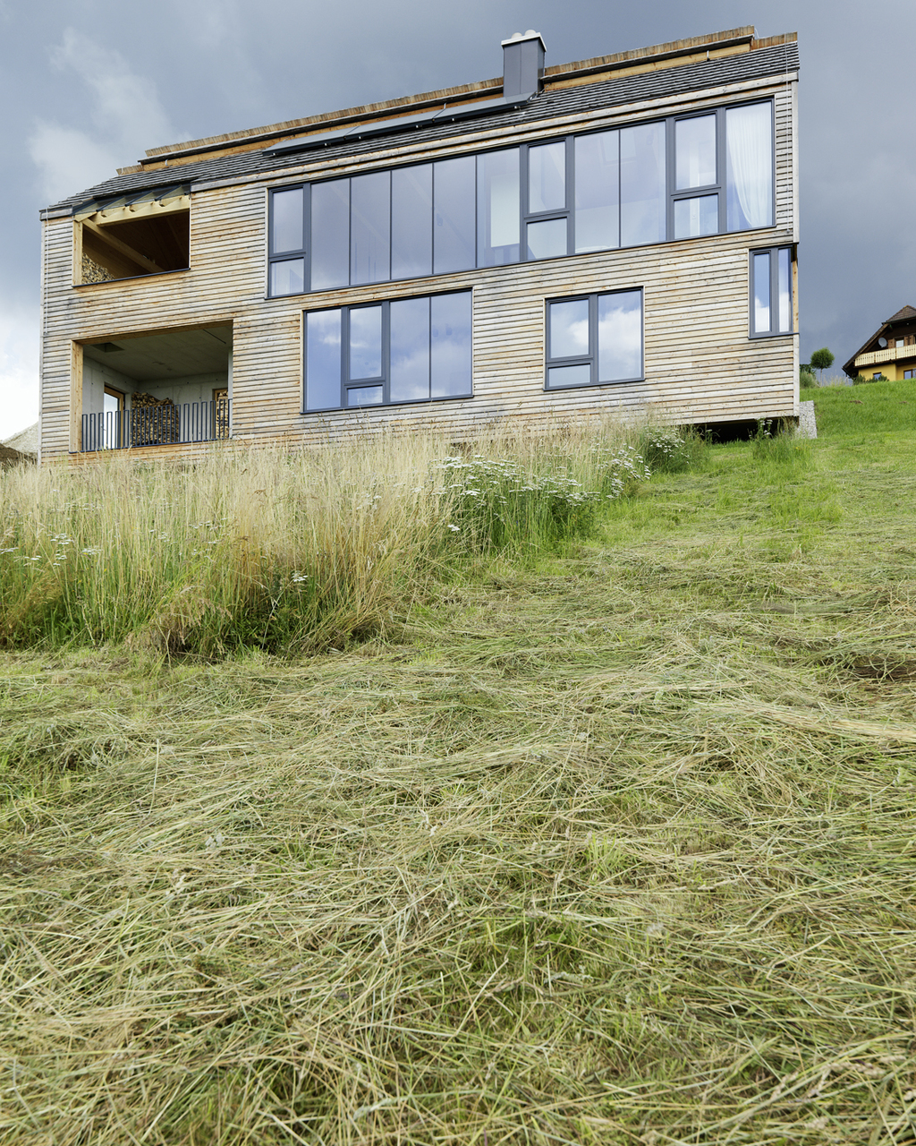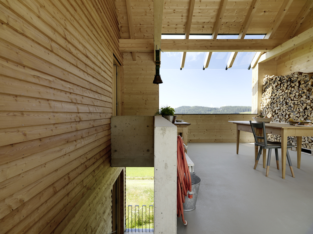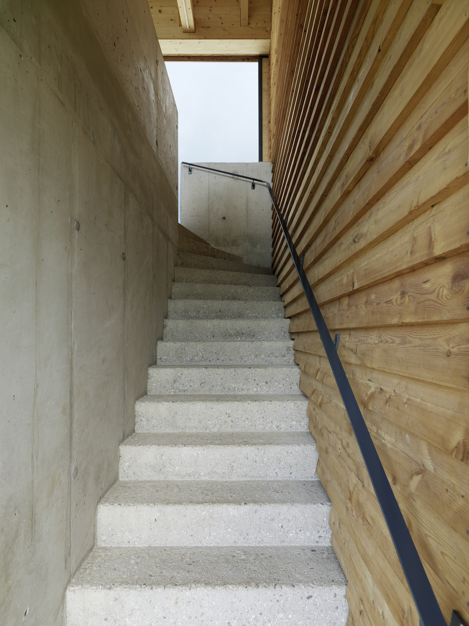 Die schmale Holzhütte liegt, mit ihrer Breitseite an den Hang geschmiegt, auf einem massiven Sockelgeschoss auf, welches talseitig ein kleines Bisschen über das Gelände hinausragt, um eine behutsame Geländebearbeitung zum Ausdruck zu bringen. Die restliche Wiese bleibt praktisch unberührt. Eine Betonbrücke führt von der Straße ins obere Geschoß des Bauwerks, in einen Vorraum, der vom Bauherren Wohngarage genannt wird. Er ist erweiterter Lebensraum im Freien, im Schutz vor Wind und Wetter, mit Blick ins Tal und zur Straßenseite mit einem breiten Schiebetor verschließbar. Im Winter kann hier aber auch einmal ein Fahrzeug eingestellt werden.
