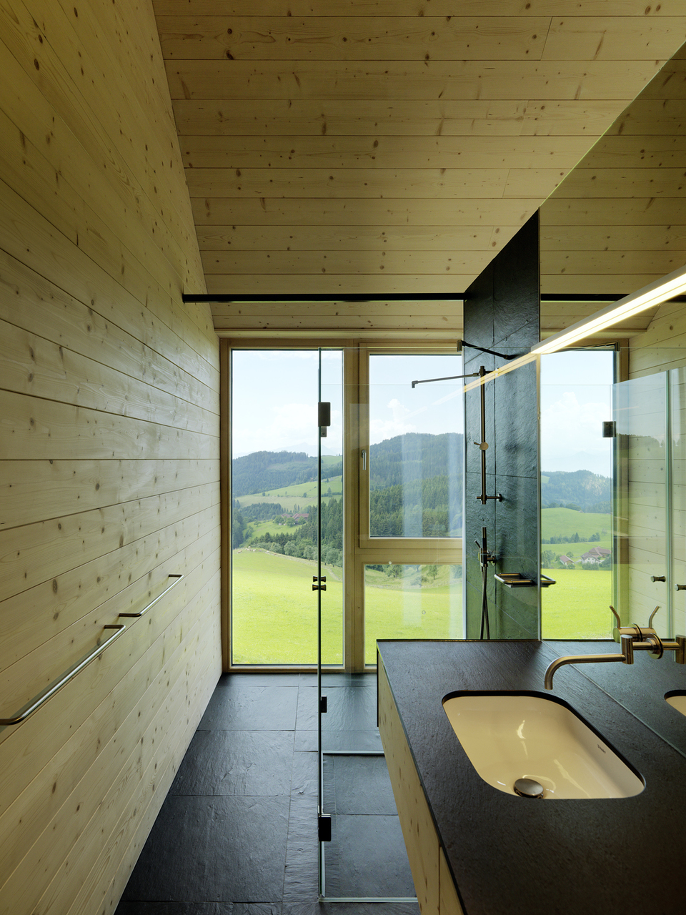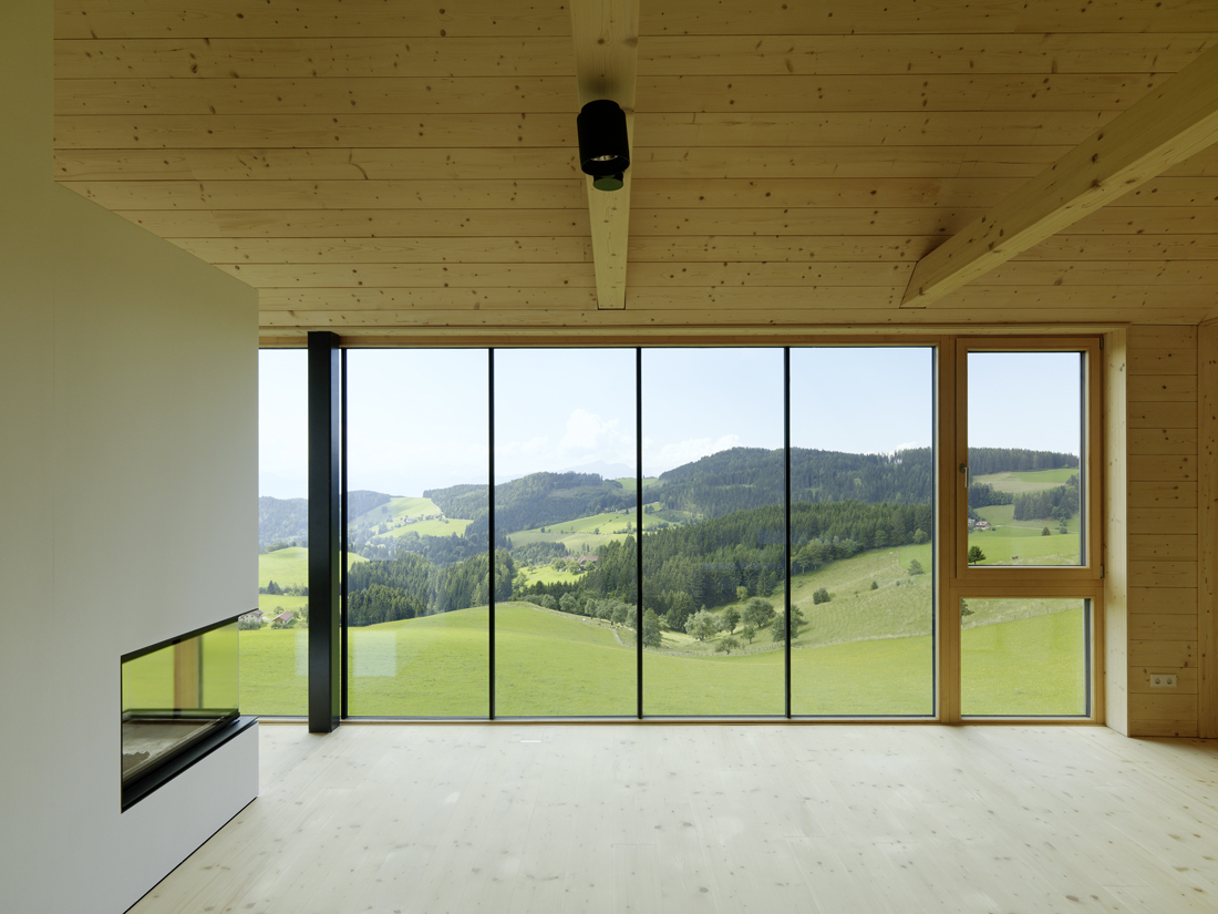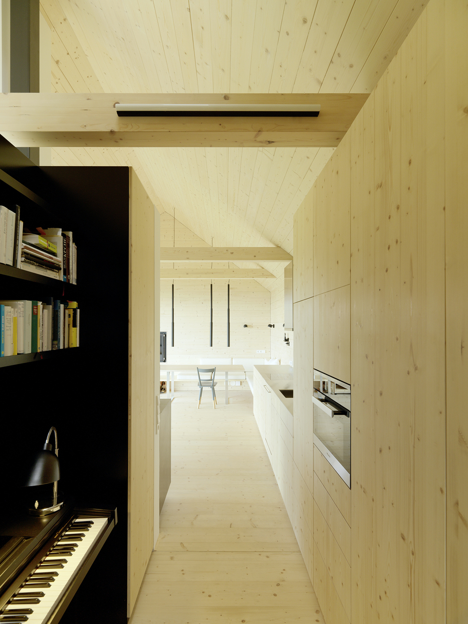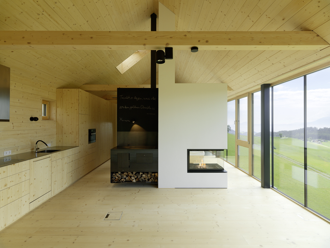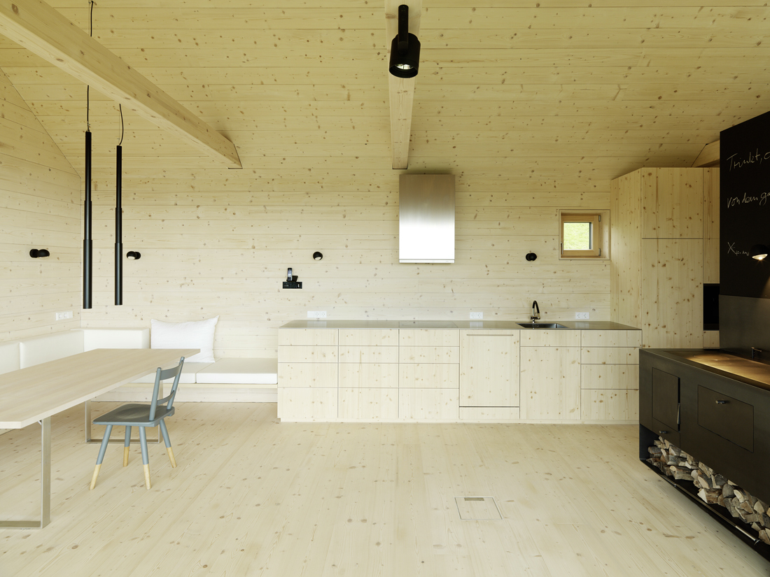 Fichtenbretter an Boden, Wand und Dachuntersicht verströmen Duft und bilden die Aura des Rückzugraumes, in dem sich alles nur um die eine große Öffnung zum Fernblick dreht. Der Rest, nämlich die nahe Umgebung, ist ausgeblendet. Ein einziger großer Raum wird vom Kaminofen und einer Schrankwand in der Mitte des Hauses in Funktionsbereiche gegliedert: Stube, Schlafnische, Kochstelle, Bad und Schrankraum. Mehr braucht es nicht. Es gibt ja noch die Wohngarage. (Text: Architekt)