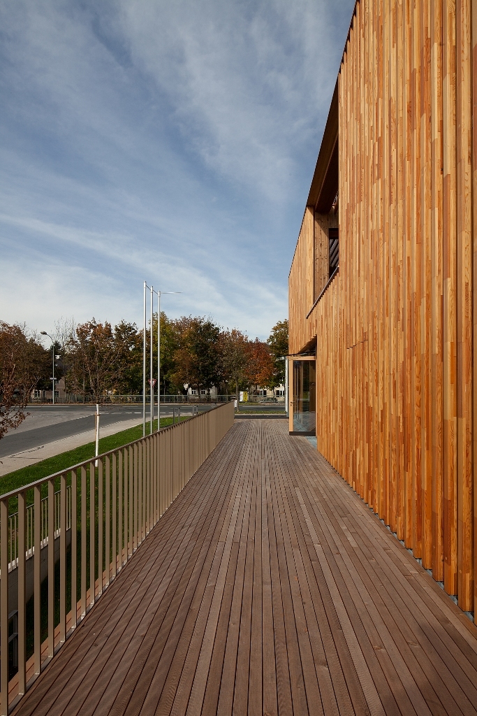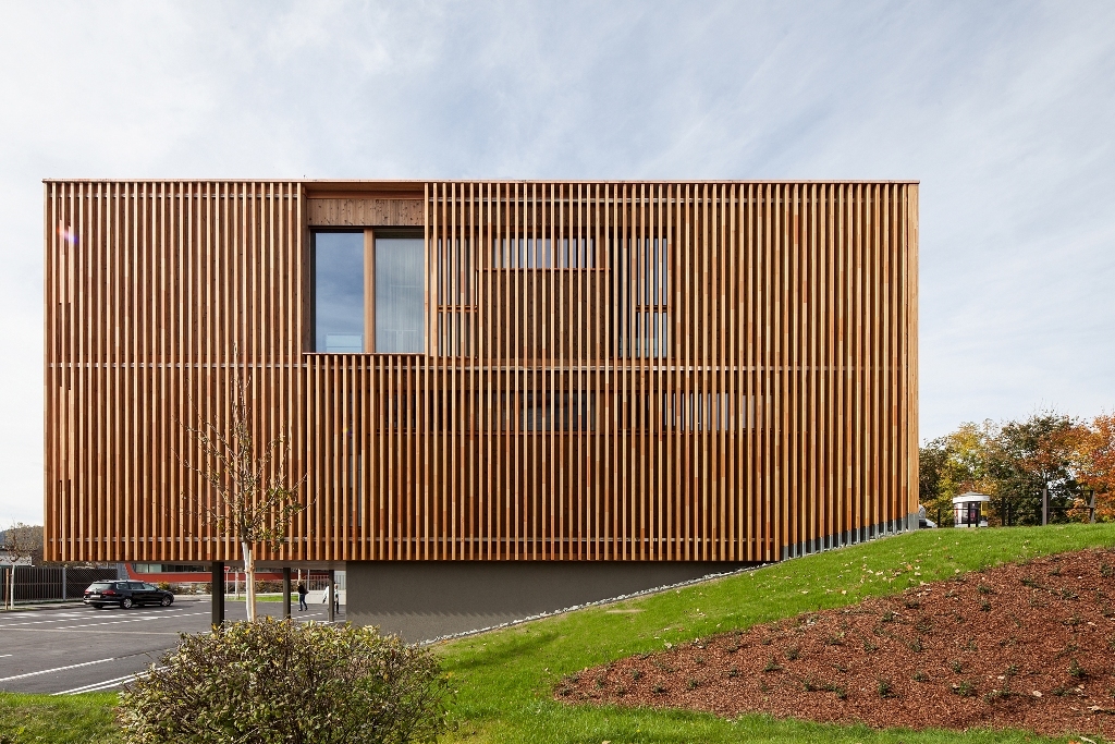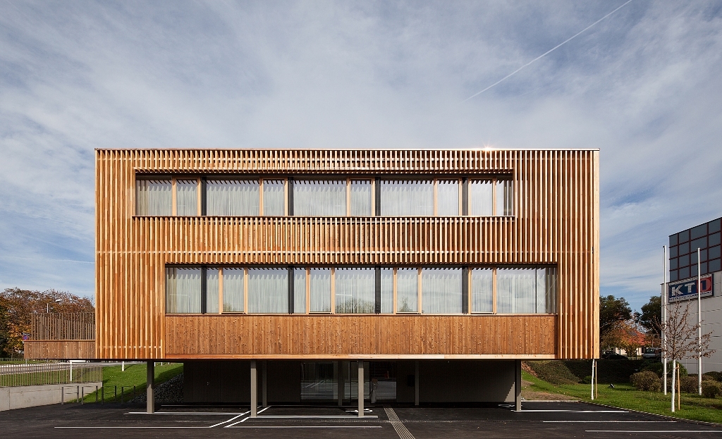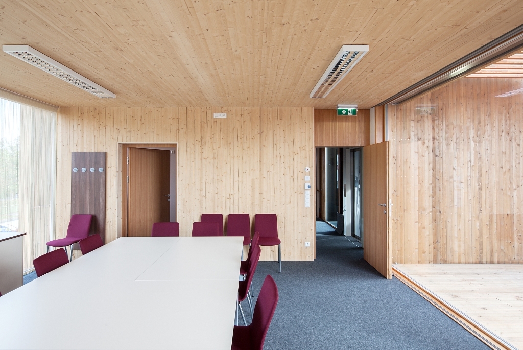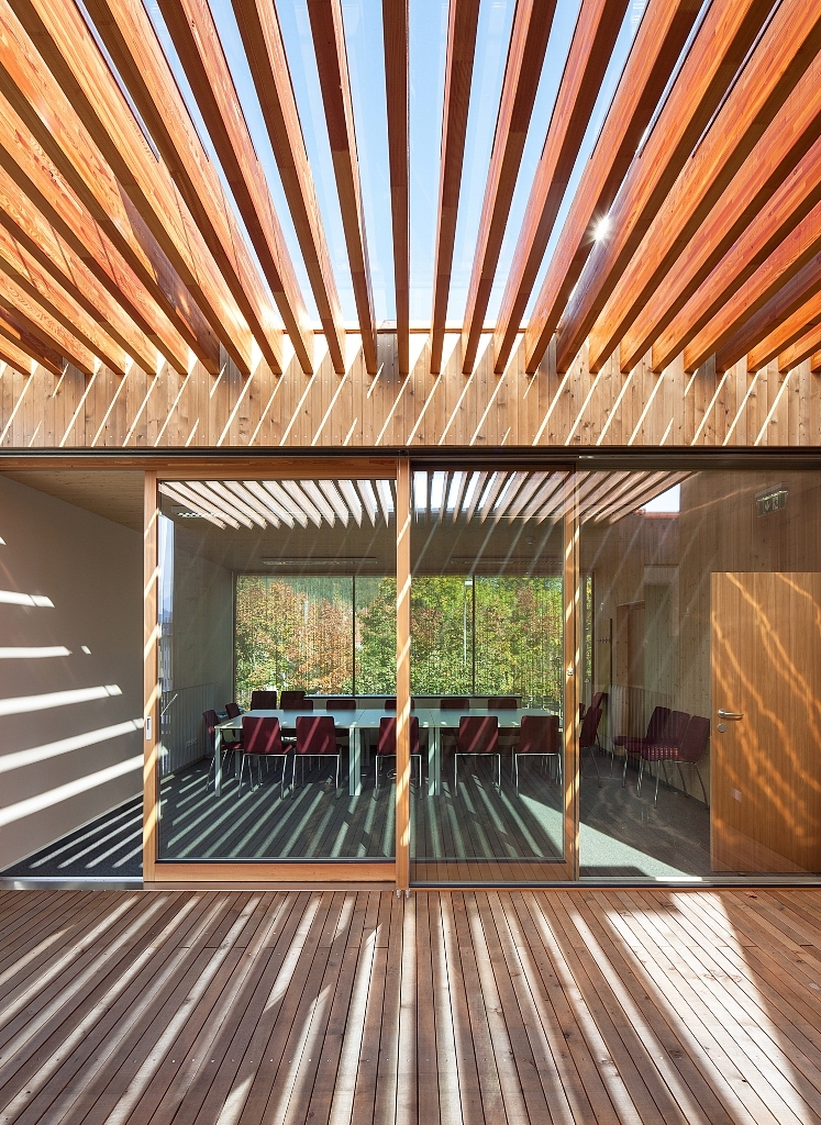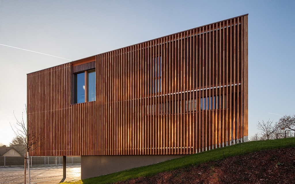 Das Sockelgeschoss des Gebäudes besteht aus Stahlbeton und wurde teilweise in das leicht geneigte Gelände eingegraben. Die beiden Obergeschosse wurden ressourcenschonend aus vorgefertigten Brettsperrholzelementen mit Sichtoberflächen im Bereich von Wänden und Decken errichtet, ihre Außenwände in Holzriegelbauweise, wodurch eine günstige CO2-Bilanz sowie eine kurze Bauzeit von neun Monaten erzielt wurden. Ein Fassadensystem aus unbehandelten Lärchenholzlamellen, die in Bereichen, in denen der unmittelbare Bezug zwischen innen und außen gewünscht war, unterbrochen sind, und vorvergrauter Schalung, ebenfalls aus Lärchenholz, verleiht dem Gebäude seine charakteristische Erscheinungsform und gliedert die Außenflächen.