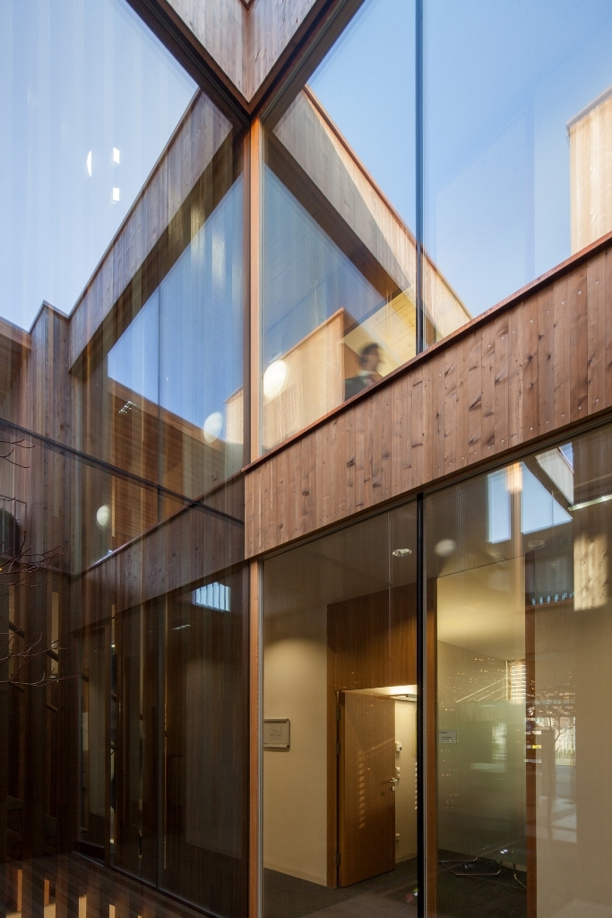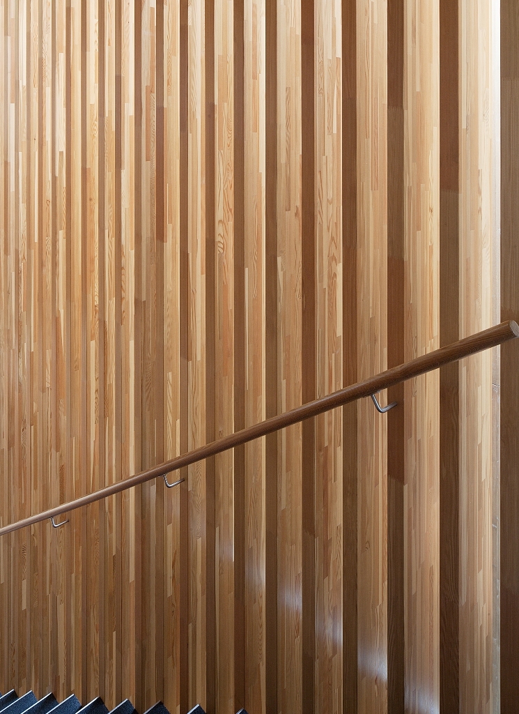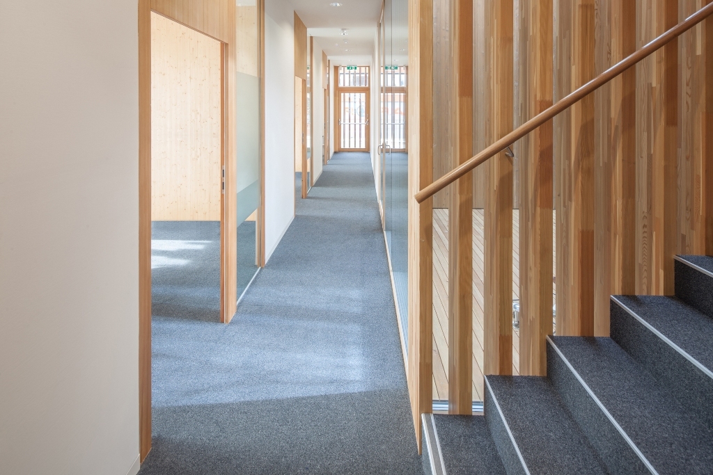 Die besondere Qualität im Inneren resultiert – neben der Materialwahl – aus der über rein funktionale Überlegungen hinausgehenden dreidimensionalen räumlichen Konzeption sowie aus dem über das Atrium und die an der Westseite des Gebäudes eingeschnittene, zur Hälfte durch ein Glasdach geschützte Terrasse einfallenden Tageslicht in allen Bereichen. Dieses wird partiell durch die Holzlamellen an der Fassade bzw. entlang der einläufigen Treppe gefiltert, was für eine wohltuende Atmosphäre sorgt. Zum Teil satinierte Verglasungen trennen die Büros von den Erschließungszonen. Dem Besprechungsraum wurde insofern eine besondere Stellung eingeräumt, als er einerseits über einen Zugang zur Terrasse verfügt und andererseits einen direkten Blick in die Baumkronen entlang des Lendkanals bietet. (Text: Architekt)