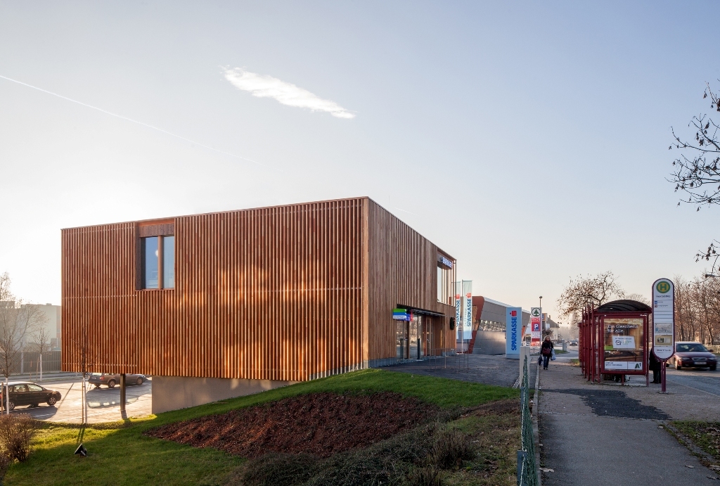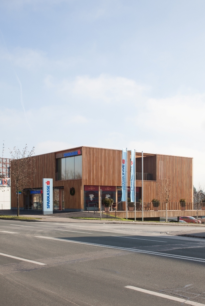 Der Baukörper wurde so positioniert, dass er sowohl – für Kunden, die mit dem Auto kommen – vom Parkplatz aus, also im Sockelgeschoss, als auch straßenseitig, im ersten Obergeschoss, betreten werden kann. Die punktförmige kompakte Setzung beinhaltet einerseits eine ruhige, zurückhaltende und dennoch präsente Komponente im heterogenen Umfeld, andererseits knüpft sie an die bestehende Villenbebauung südlich der Villacher Straße und jenseits des Lendkanals an.