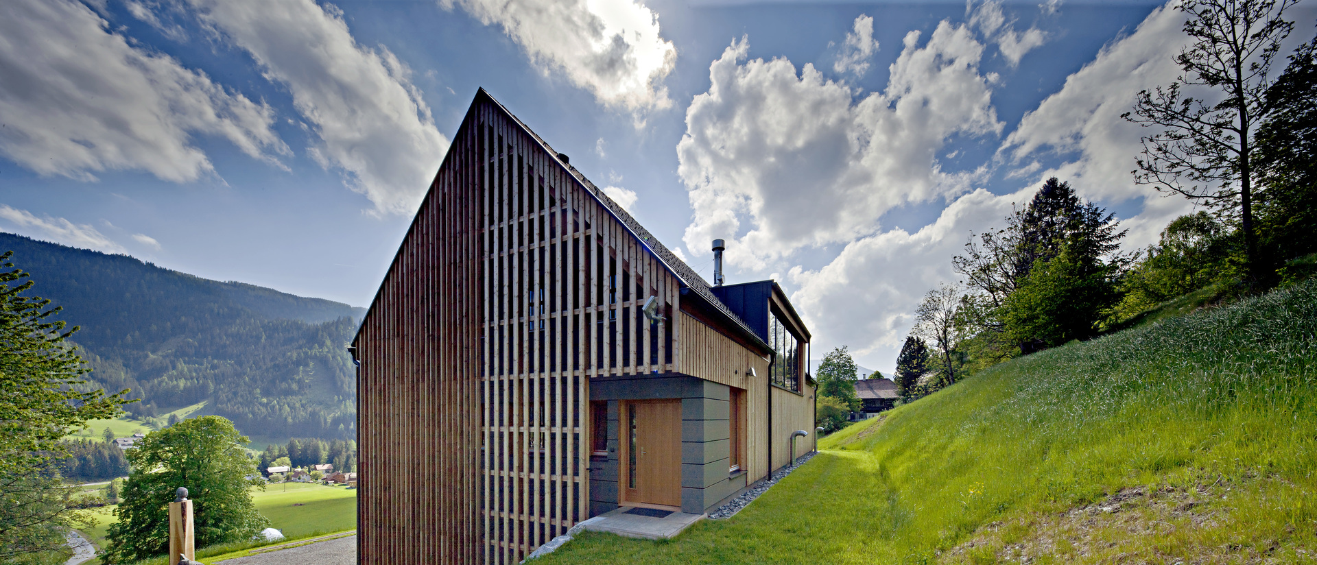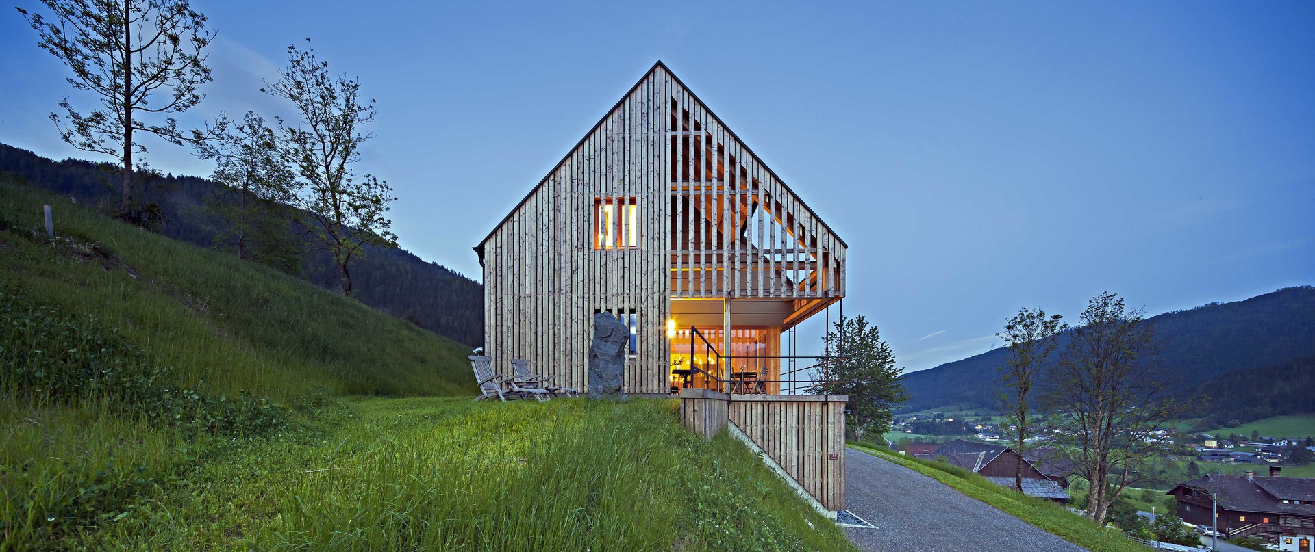Entstanden ist ein quer im Hang liegender Holzbau mit vier Ebenen, E1 mit Keller und Garage, E2 mit Wohnen Essen Schlafen, E3 als Rückzug Galerie und Besucherteil… der im E4 als Schlafkammer endet. Wichtigster Raum ist der mittig liegende quadratische Wohnraum mit offenem Feuer und Galeriegeschoß der Großzügig verglast von einer statisch raffinierten Tragstruktur dreigeschoßig überspannt wird. Ostseitig befinden sich die Schlafräume über drei Ebenen, westseitig liegen die teilüberdachte Terrasse und der Rückzugsraum mit Panoramafenster.
