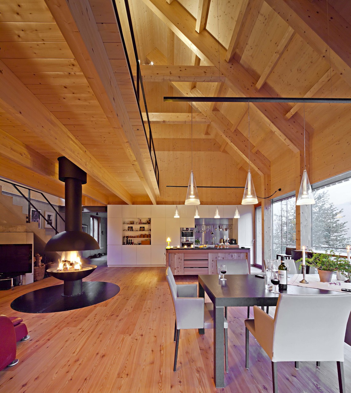 Holzwände, offenes Feuer, große Glasflächen, großräumliches Dachgebälk, Galerie, Besucherwohnung, Rückzugsraum, drei Garagenplätze und doch zurückgenommen in die Landschaft setzen…waren die Vorgaben.