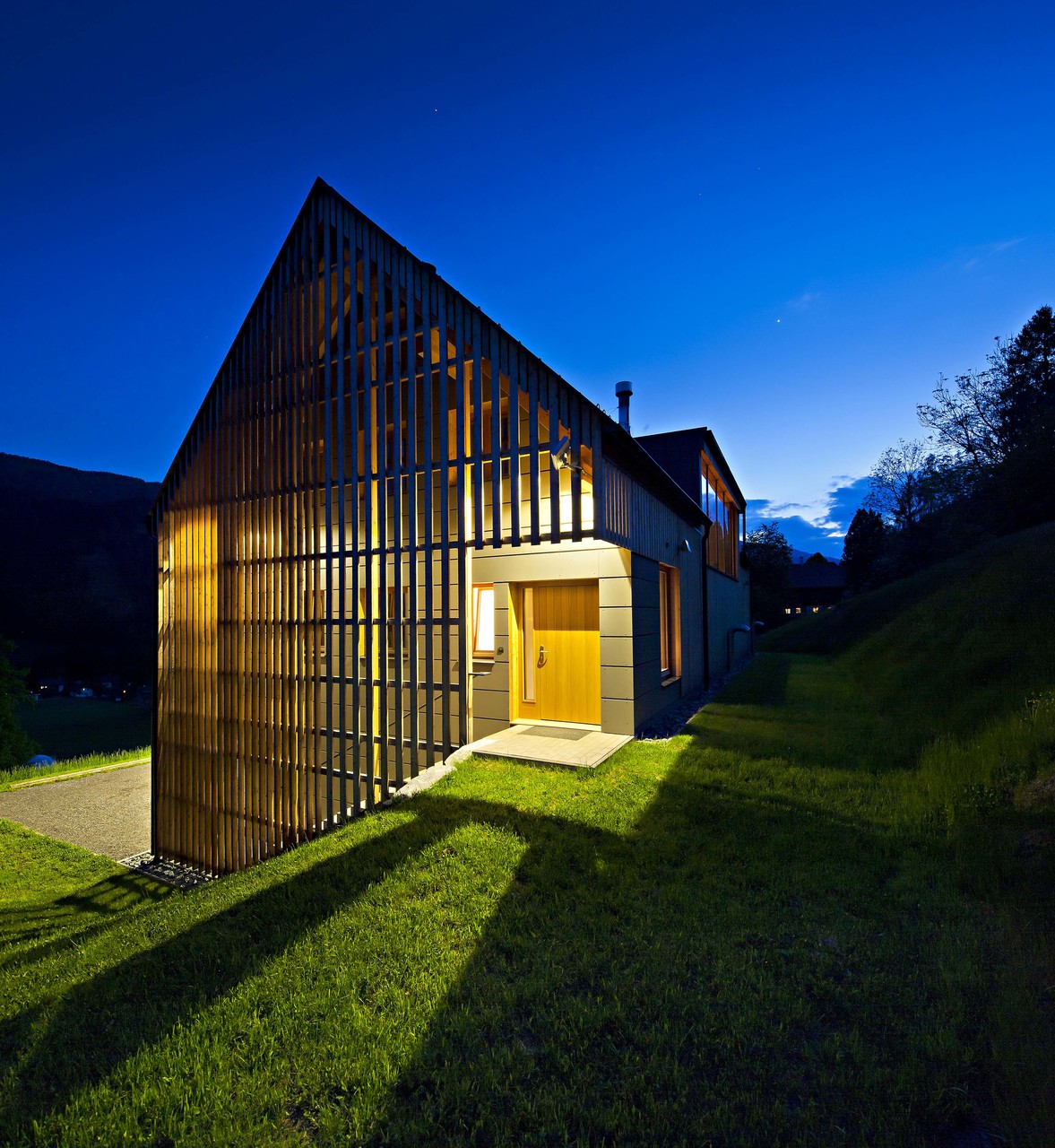 Geheizt wird wenn nicht mit dem mächtigen offenen Kamin mit einer Pelletsanlage…oder mit der Sonne. Gedämmt wurde mit 20cm Steinwolle und 3-fach Isolierglas in Lärchenholzfenster. (Text: Architekt)