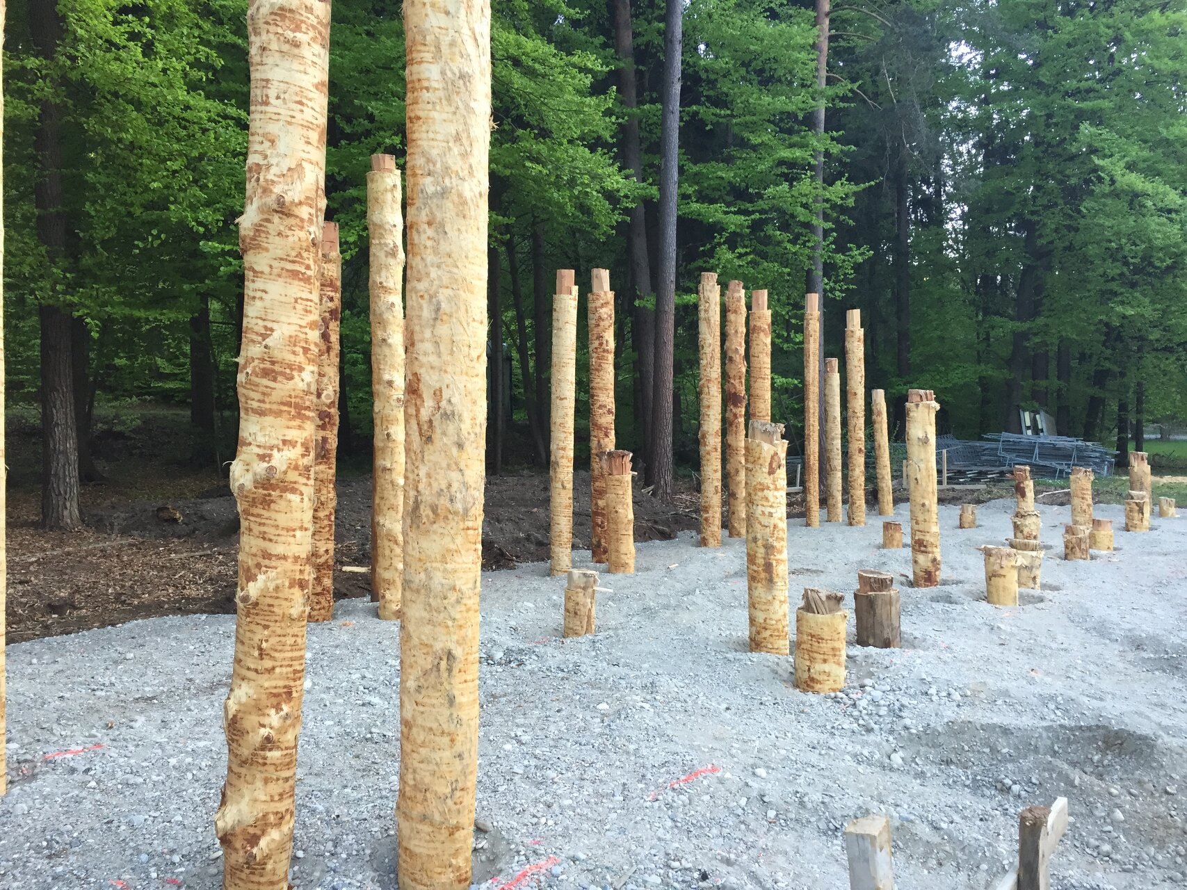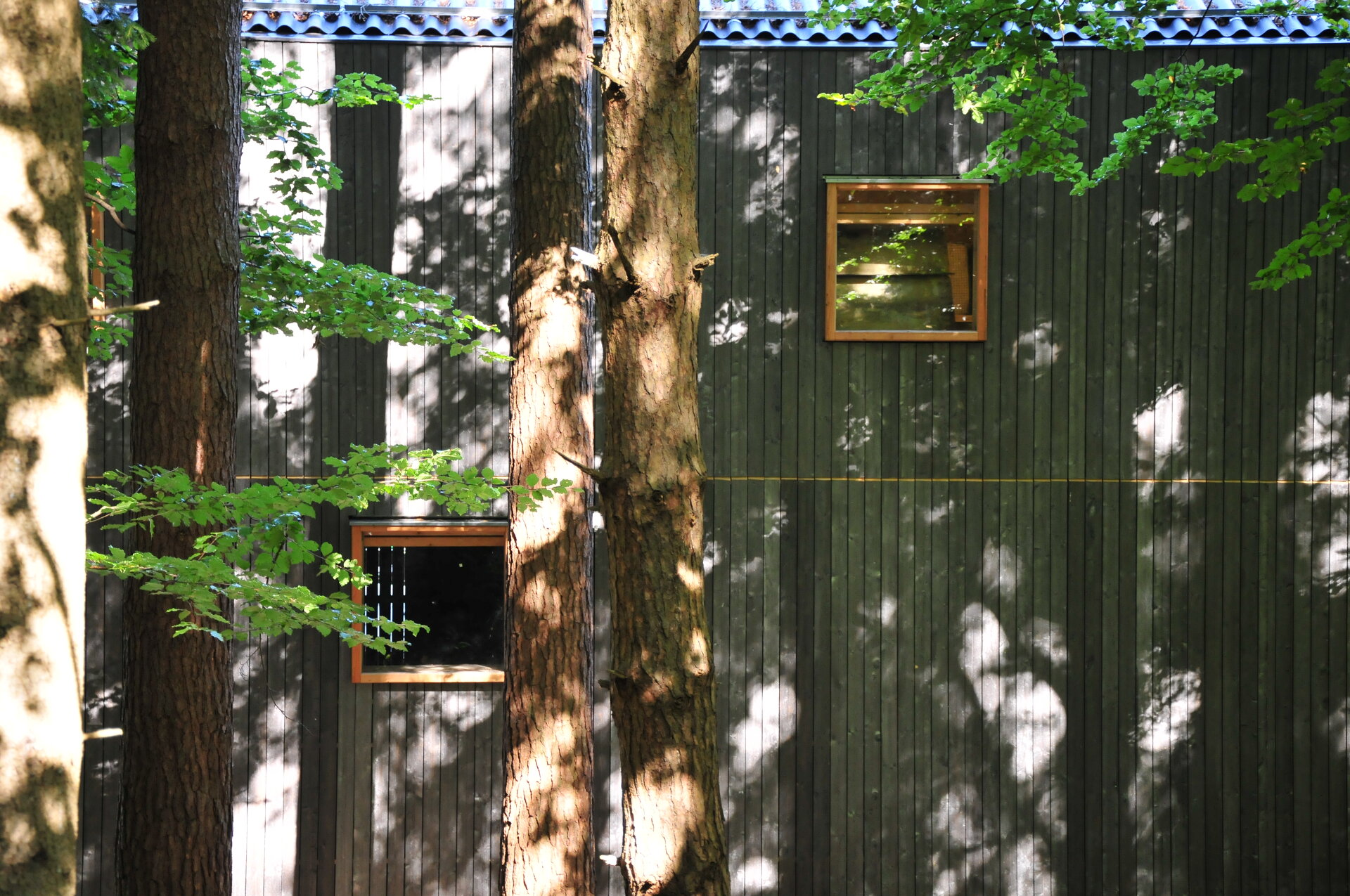 Das geringe Budget wurde durch einen hohen Anteil an Eigenleistungen ausgeglichen und zwangen zusätzlich zur Konzentration auf das Notwendigste: eine Stahlkonstruktion steht auf einer Stahlbetonplatte und ist mit Holzpfählen gegründet. Der Zweckbau wird vorwiegend als Lager genutzt und ist in seiner Gestaltung sehr zurückhaltend. Material und auch die Dimension sind vom Vorgängerbau inspiriert und neu interpretiert worden. Erschlossen wird das Obergeschoss durch einen vorgebauten Treppenaufgang. Ein Spiel aus unterschiedlichen Fensteröffnungen und -schlitze strukturieren die Holzfassade und bietet Ausblicke in den Wald und auf das Vereinsgelände. (Text: Raffaela Lackner)