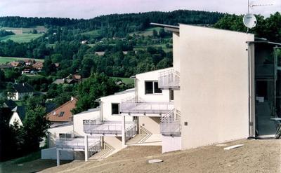 Die Bauweise soll die Kleinmaßstäblichkeit der umgebenden Bebauung aufnehmen, und außerdem das natürliche Gelände soweit als möglich erhalten. Dies wird durch die Gliederung des Baukörpers (Dachflächenstruktur) erreicht. (Text: Architektin)
