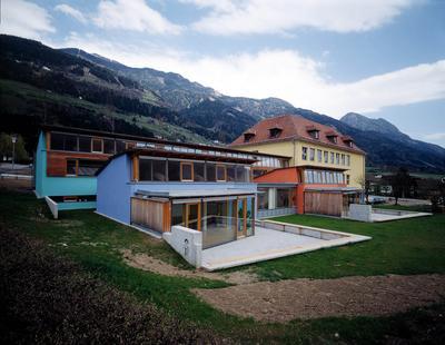 Entlang einer „Gartenmauer“ - eine Brücke signalisiert den Kindergarteneingang - erreicht man die Schule. Alle an diese Nordwand angelagerten Räume (Direktion der Volksschule, Gruppenraum und zweigeschossige Halle des Kindergartens) sind gegen Süden und auf die markante Bergwelt hin ausgerichtet. Die verschiedenen Funktionsbereiche des Kindergartens, als differenzierte Baukörper ablesbar, sind südlich, der Topografie folgend, tiefer angeordnet.