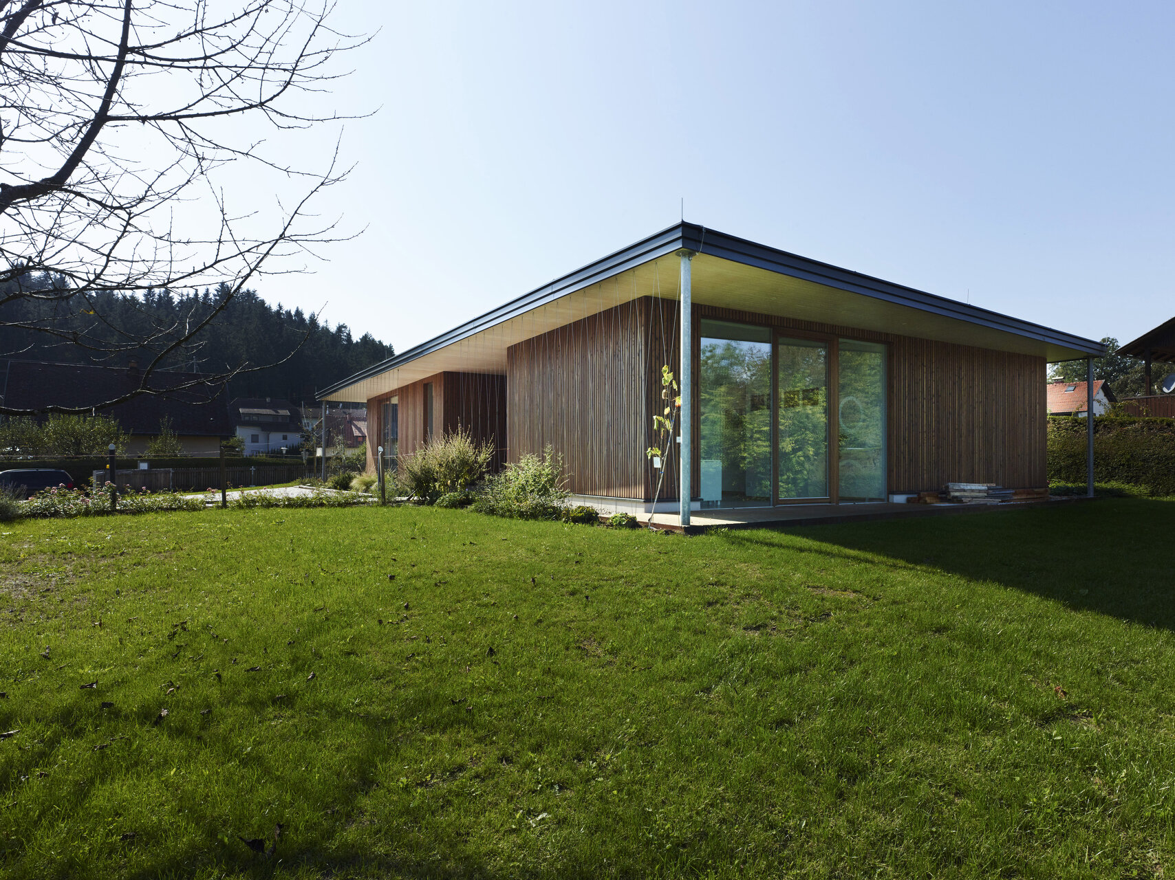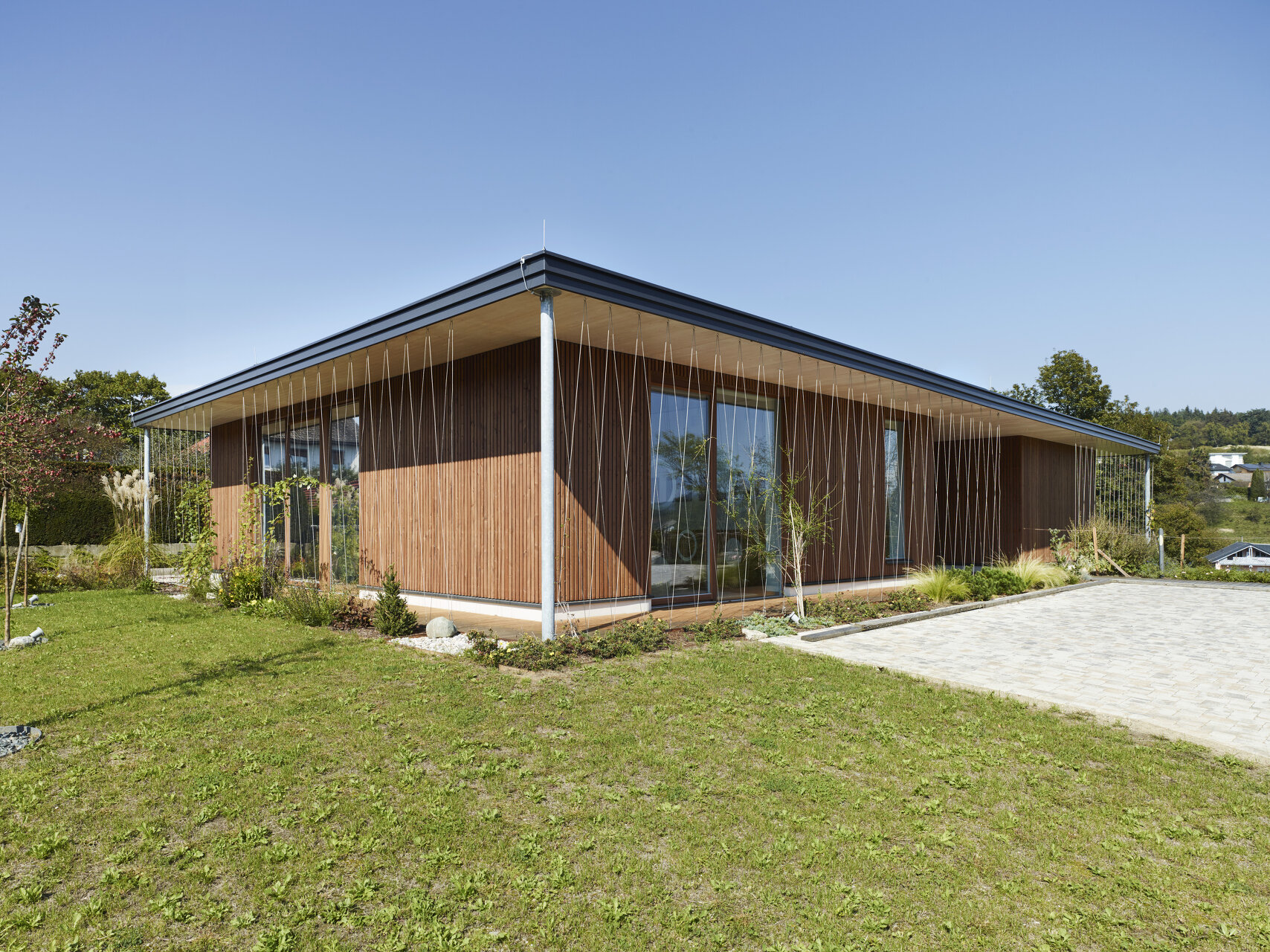 Der rechteckige Grundbaukörper wird durch ein dynamisch auskragendes Dach überdeckt. An den großzügigen Vordächern befestigte Metallseile dienen als Rankgerüst für Kletterpflanzen, welche mit zunehmendem Wachstum eine zusätzliche vorgelagerte Fassadenebene bilden.