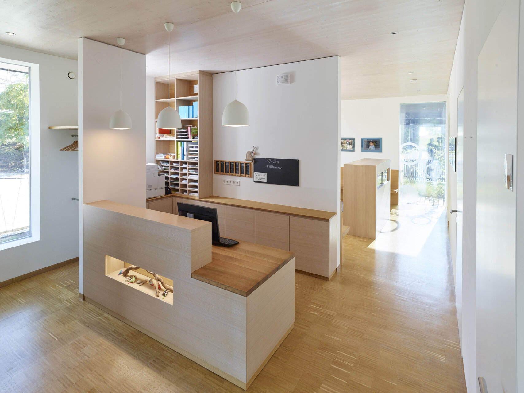 Um das Warten mit kleinen Kindern möglichst angenehm zu gestalten, gibt es von den Wartebereichen direkte Ausgänge zu vorgelagerten Spielflächen. (Text: Architekten)