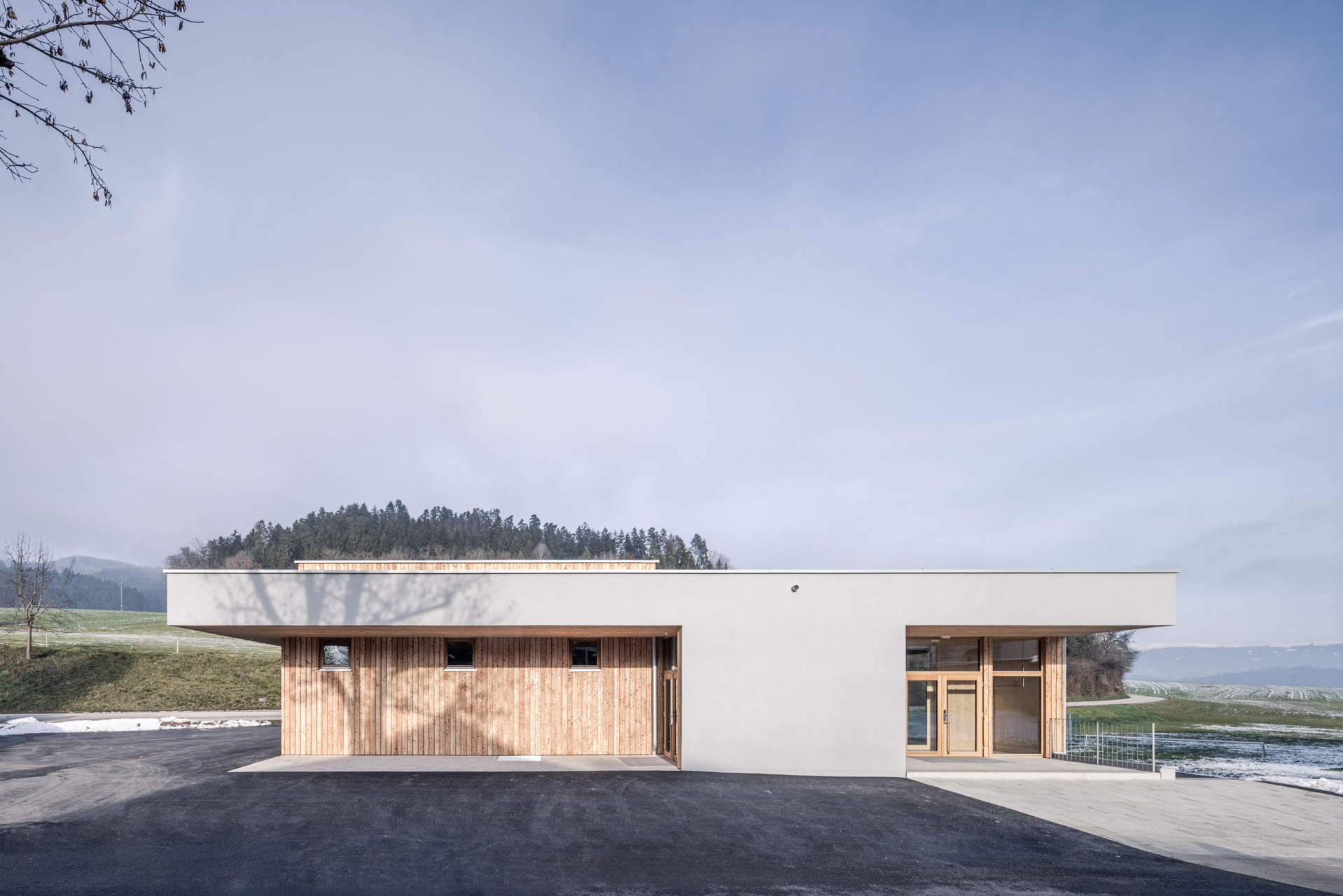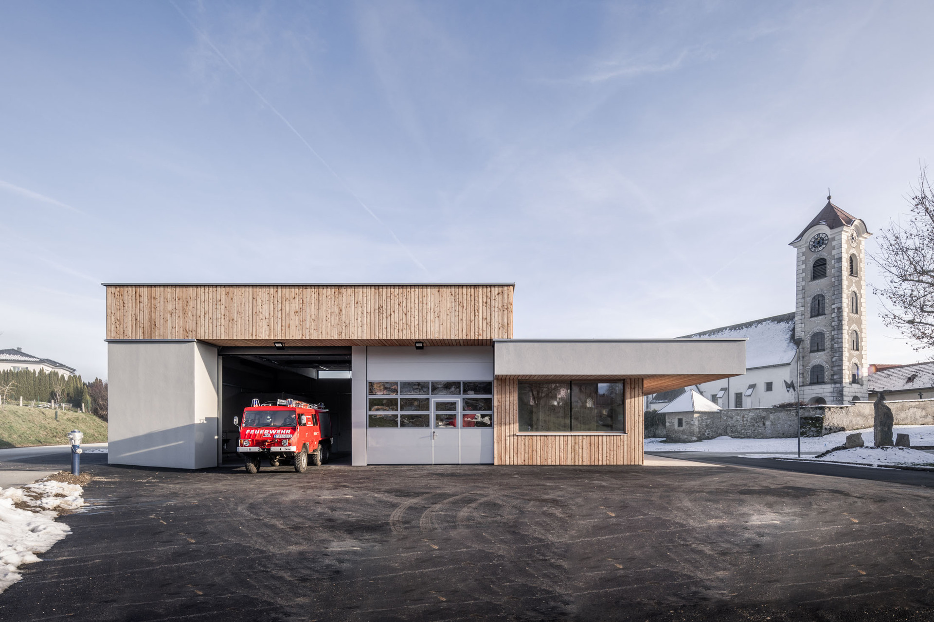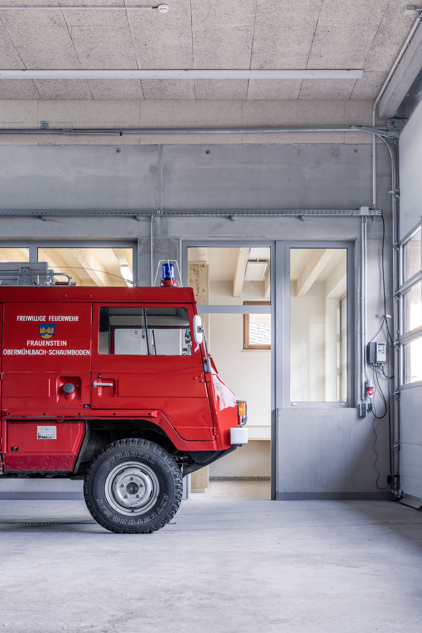 Das nahezu quadratisch proportionierte Gebäude ist als Mischbauweise konzipiert. Die Fahrzeughalle wurde gänzlich in robustem Stahlbeton ausgeführt. Um die Fahrzeughalle wird in konstruktiver Holz-Riegelbauweise der niedrigere Gebäudeteil mit Multifunktionsraum inklusive Nebenräume angebaut. Die Fassadengestaltung ordnet sich der umgebenden Bebauung unter. So ist die äußere Gebäudehülle verputzt ausgeführt, die rückspringenden und überdachten Zugangsbereiche sind umseitig mit einer Lärchenschalung versehen. Passend dazu sind auch die Fenster in Lärche ausgeführt. Im Innenraum sind sämtliche Wandoberflächen und Möbel aus Fichtenholz hergestellt. (Text: Architekt:innen)