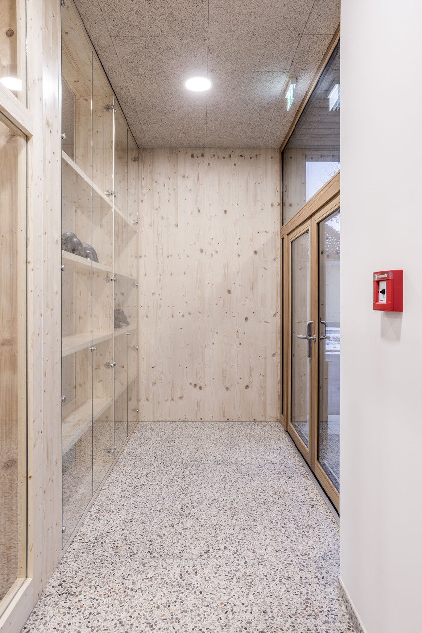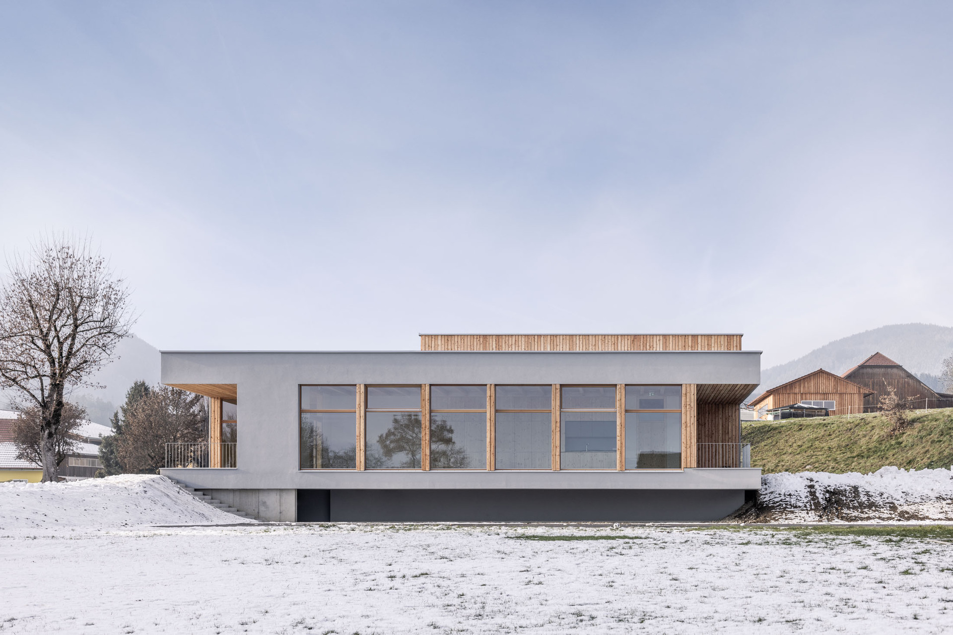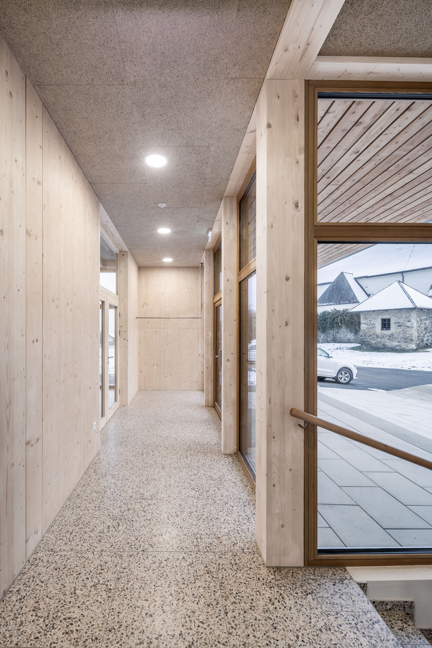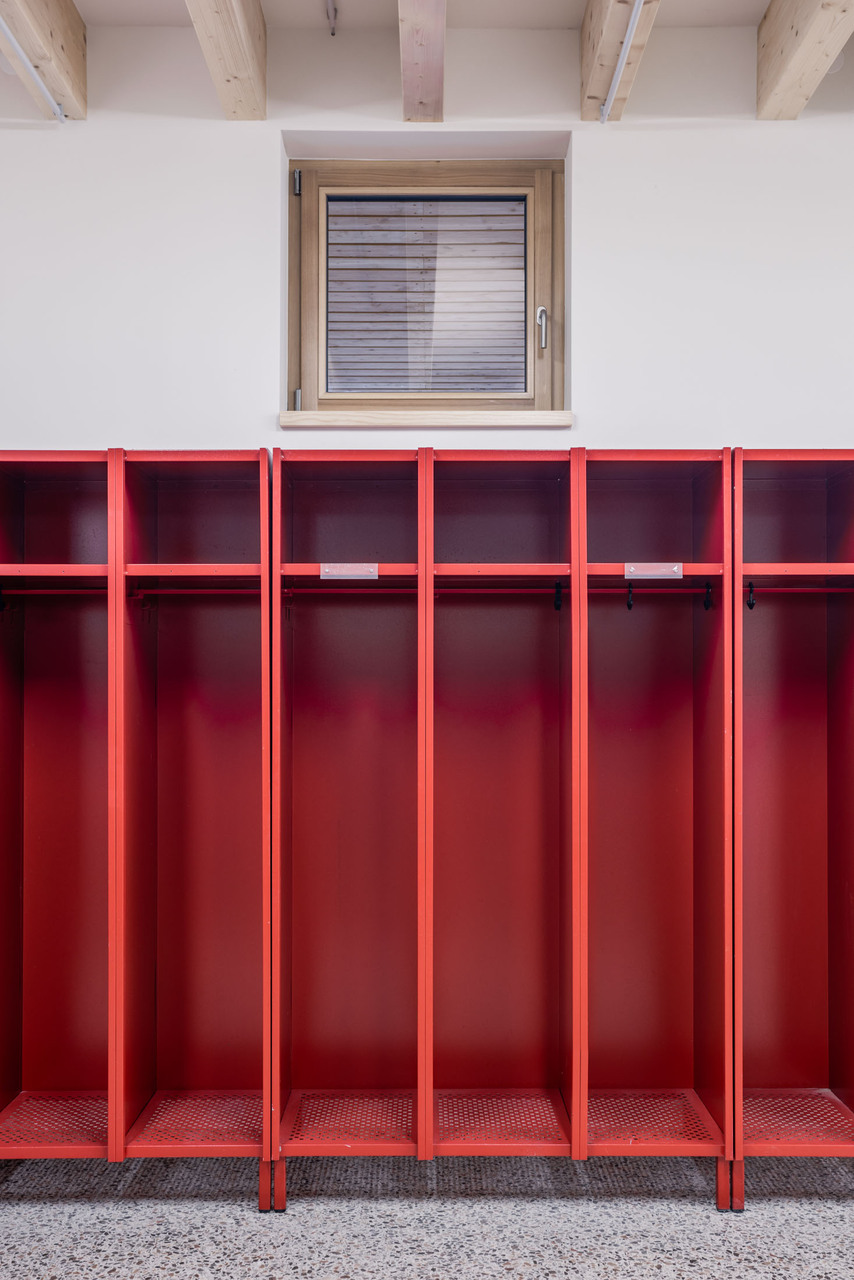 Das nahezu quadratisch proportionierte Gebäude ist als Mischbauweise konzipiert. Die Fahrzeughalle wurde gänzlich in robustem Stahlbeton ausgeführt. Um die Fahrzeughalle wird in konstruktiver Holz-Riegelbauweise der niedrigere Gebäudeteil mit Multifunktionsraum inklusive Nebenräume angebaut. Die Fassadengestaltung ordnet sich der umgebenden Bebauung unter. So ist die äußere Gebäudehülle verputzt ausgeführt, die rückspringenden und überdachten Zugangsbereiche sind umseitig mit einer Lärchenschalung versehen. Passend dazu sind auch die Fenster in Lärche ausgeführt. Im Innenraum sind sämtliche Wandoberflächen und Möbel aus Fichtenholz hergestellt. (Text: Architekt:innen)