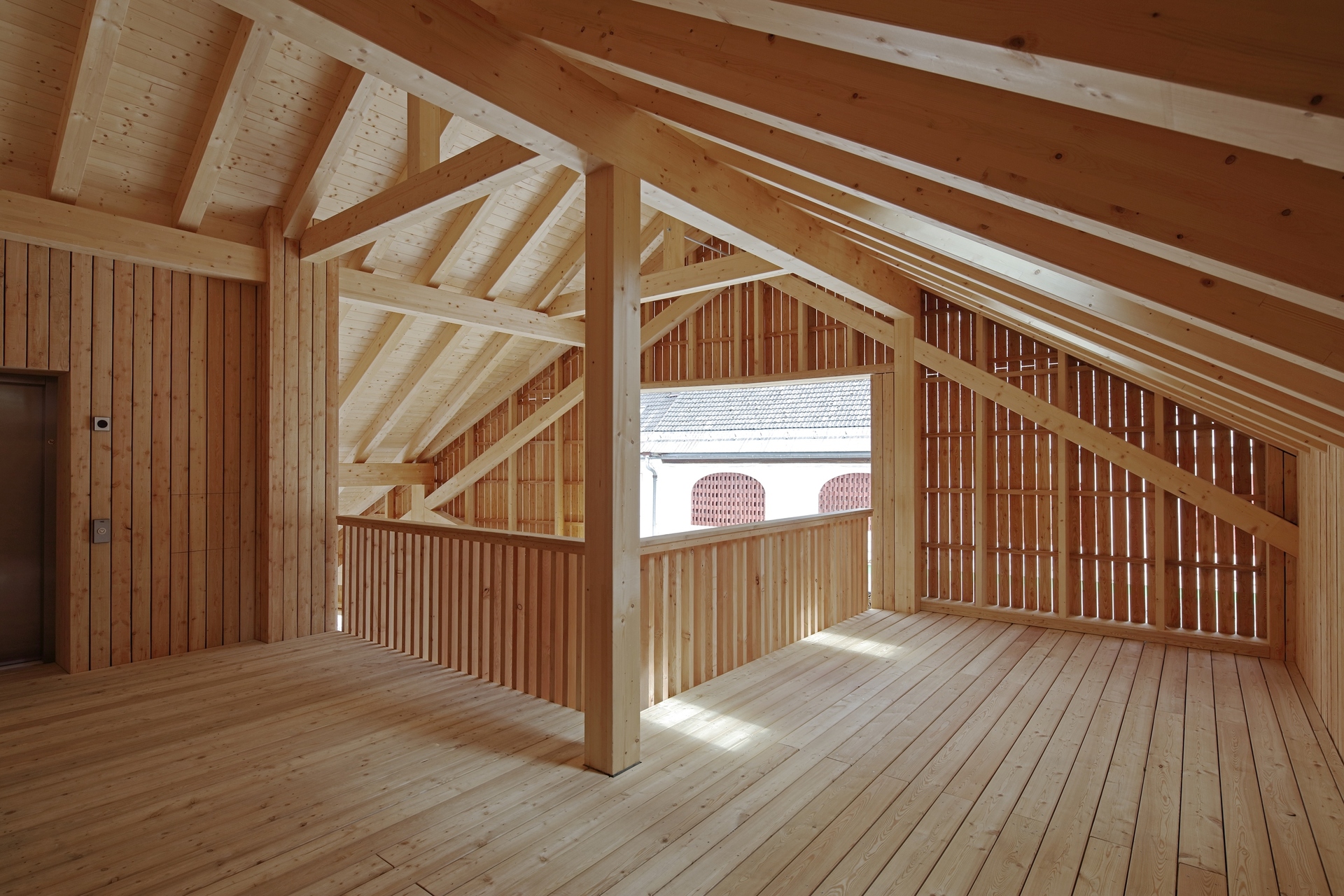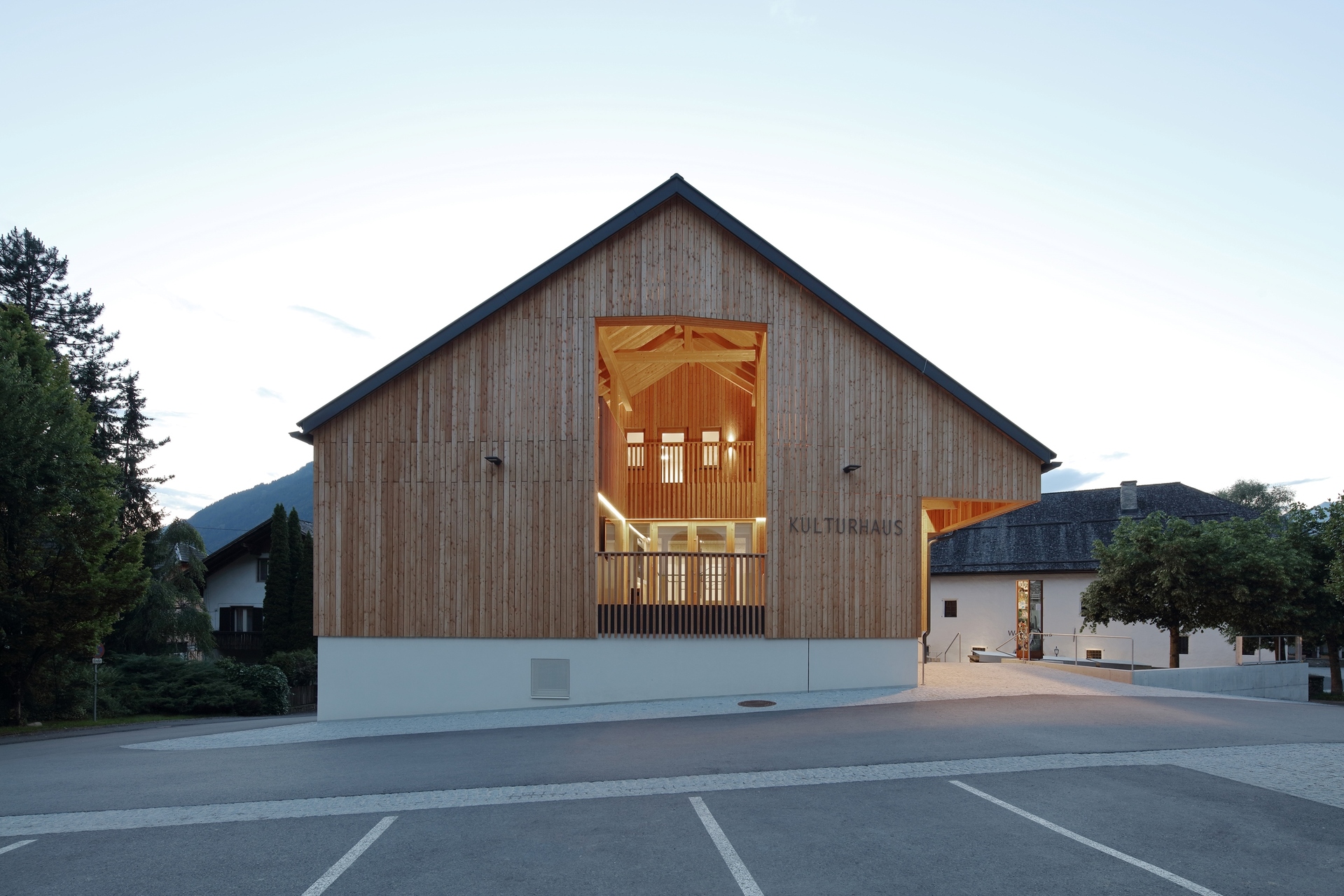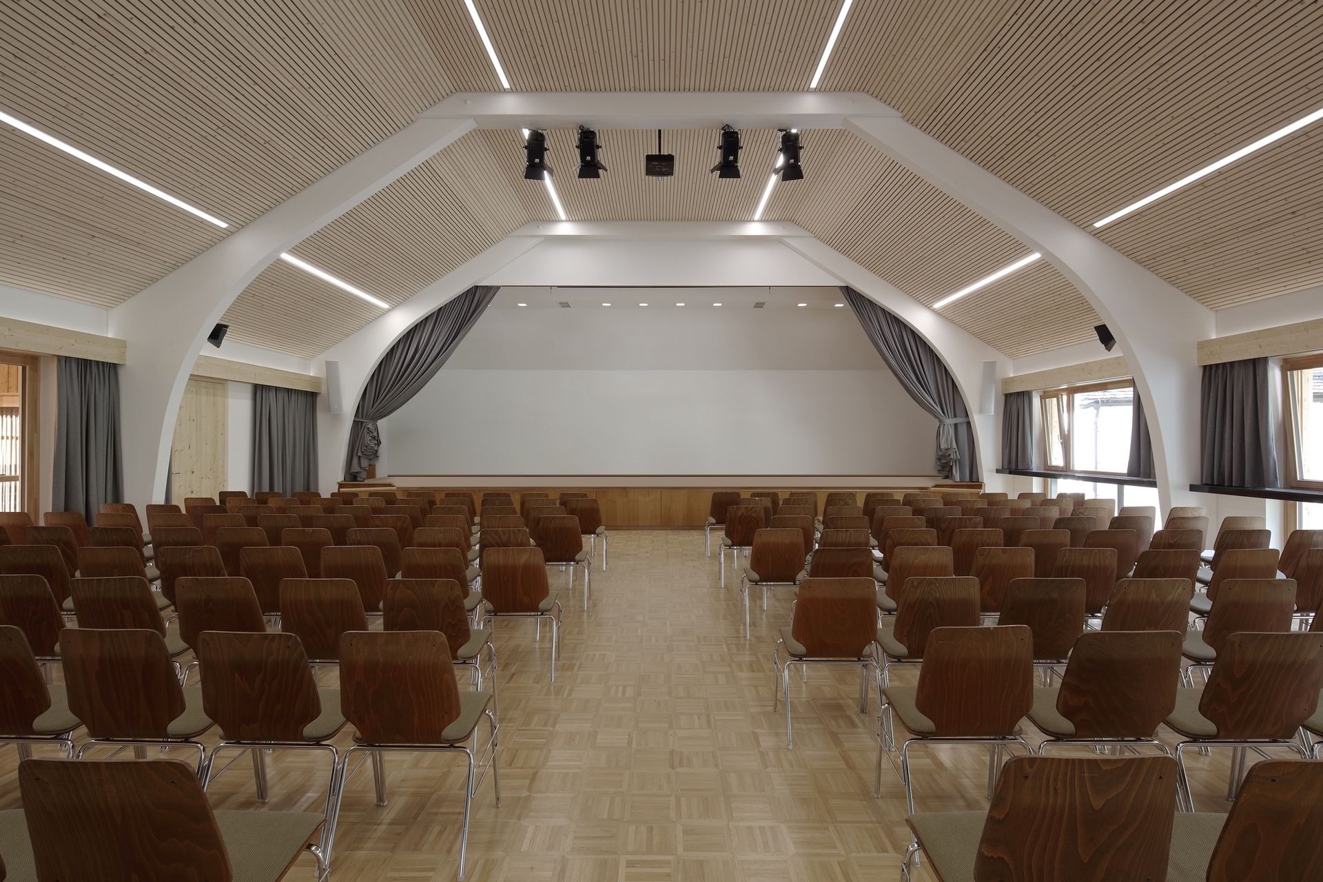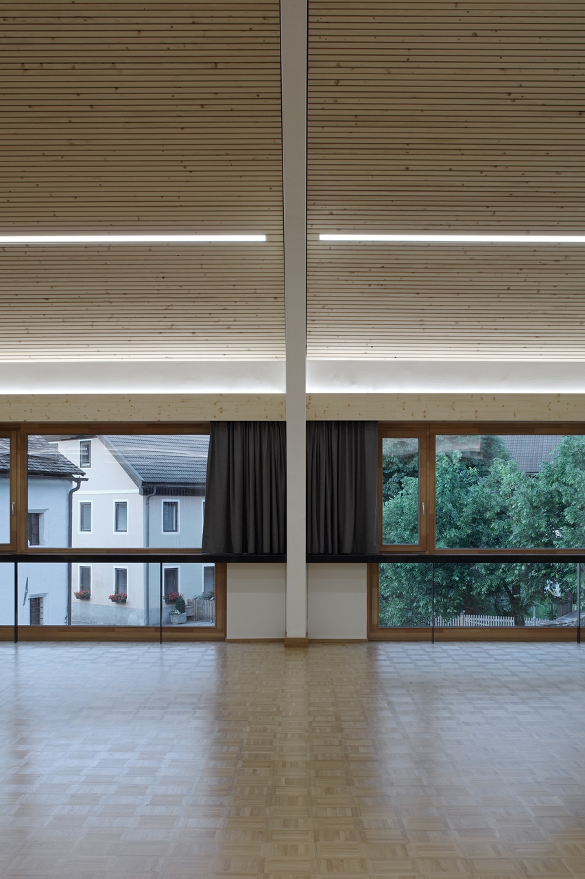 Im Saal werden die Öffnungen Richtung Wallnerhaus zu großen, verglasten Elementen zusammengefasst, die eine einfache, aber großzügige Sichtverbindung zum Platz herstellen. Kleine, öffenbare Flügel ergänzen Möglichkeiten wie Fensterlüftung oder akustische Anforderungen.