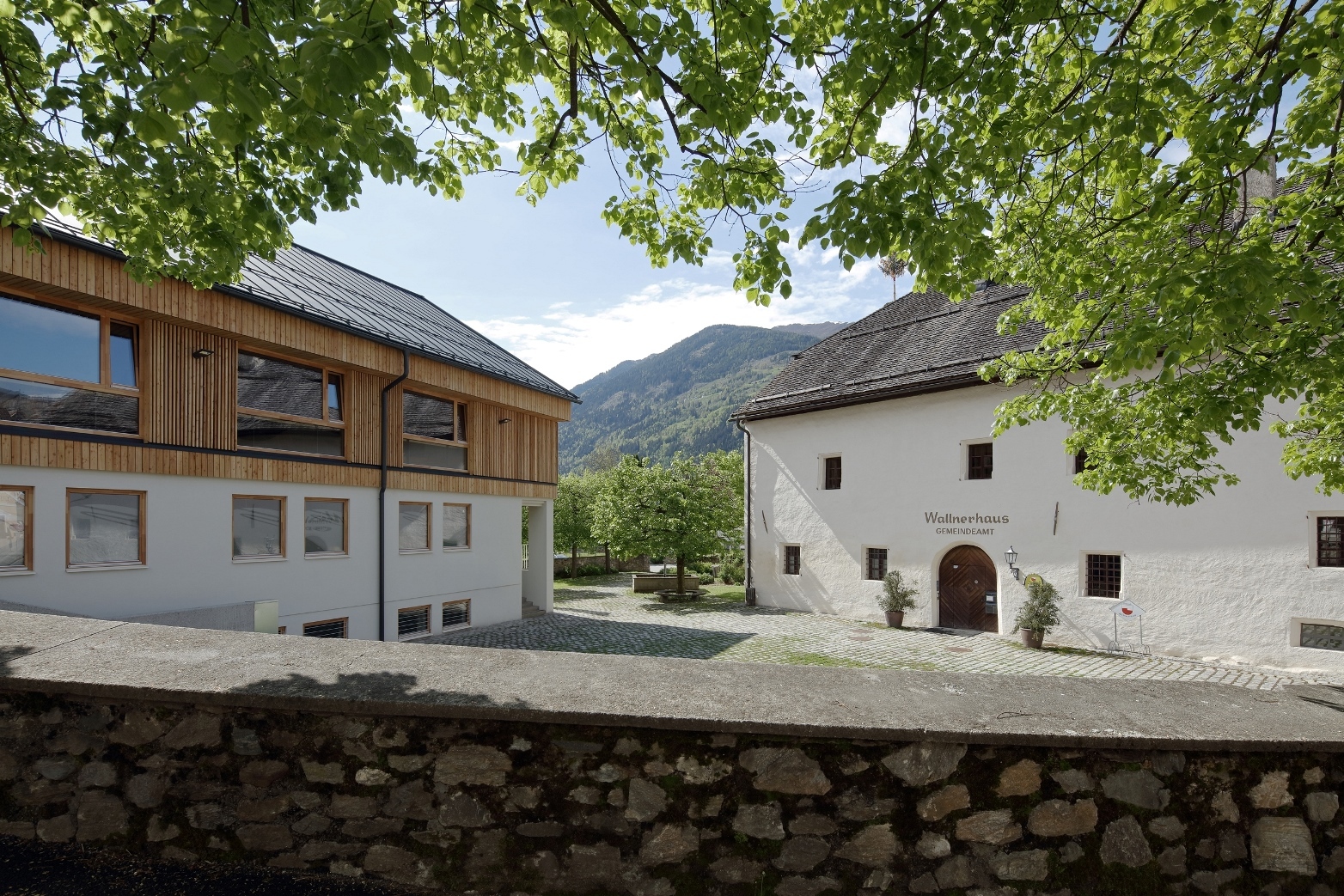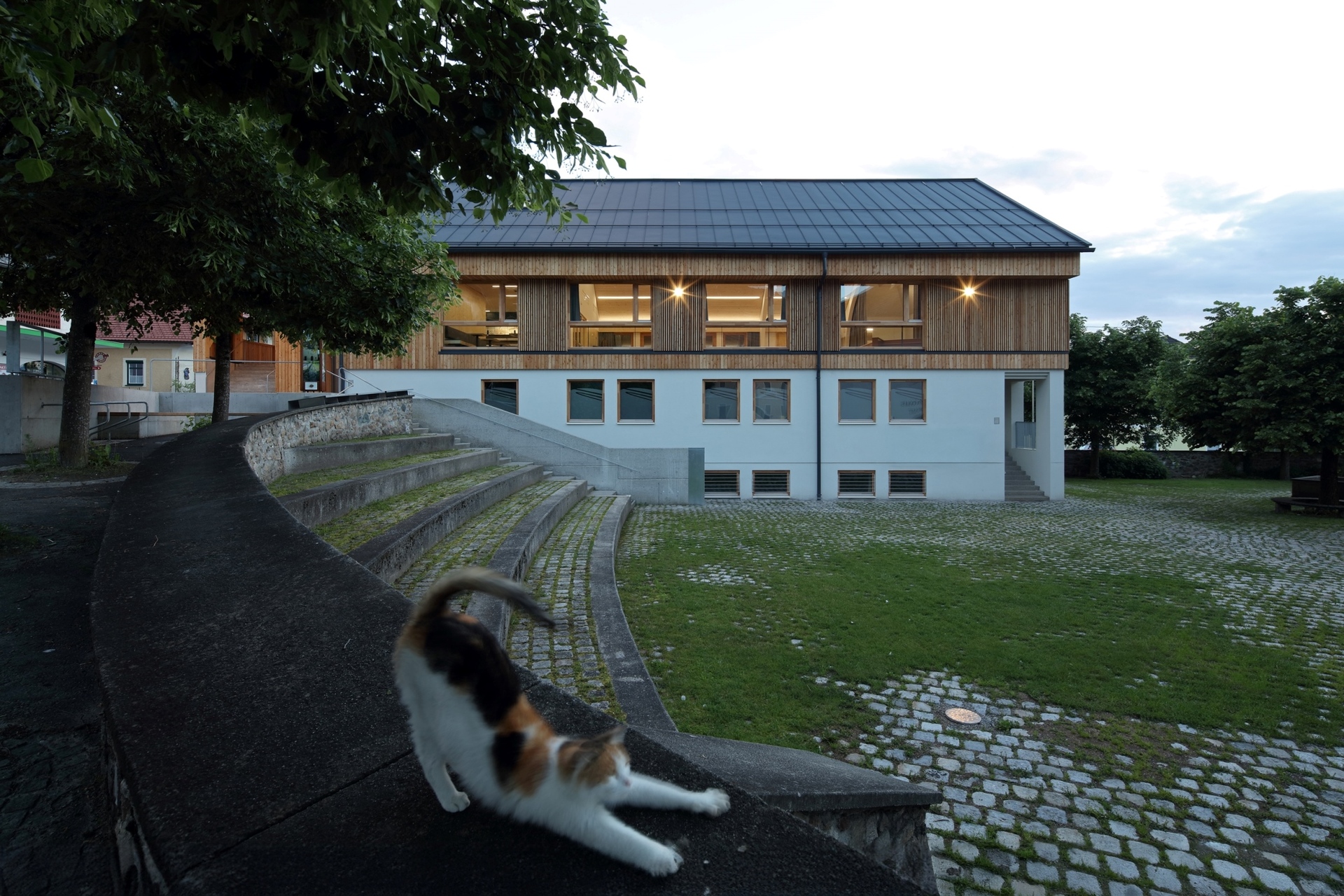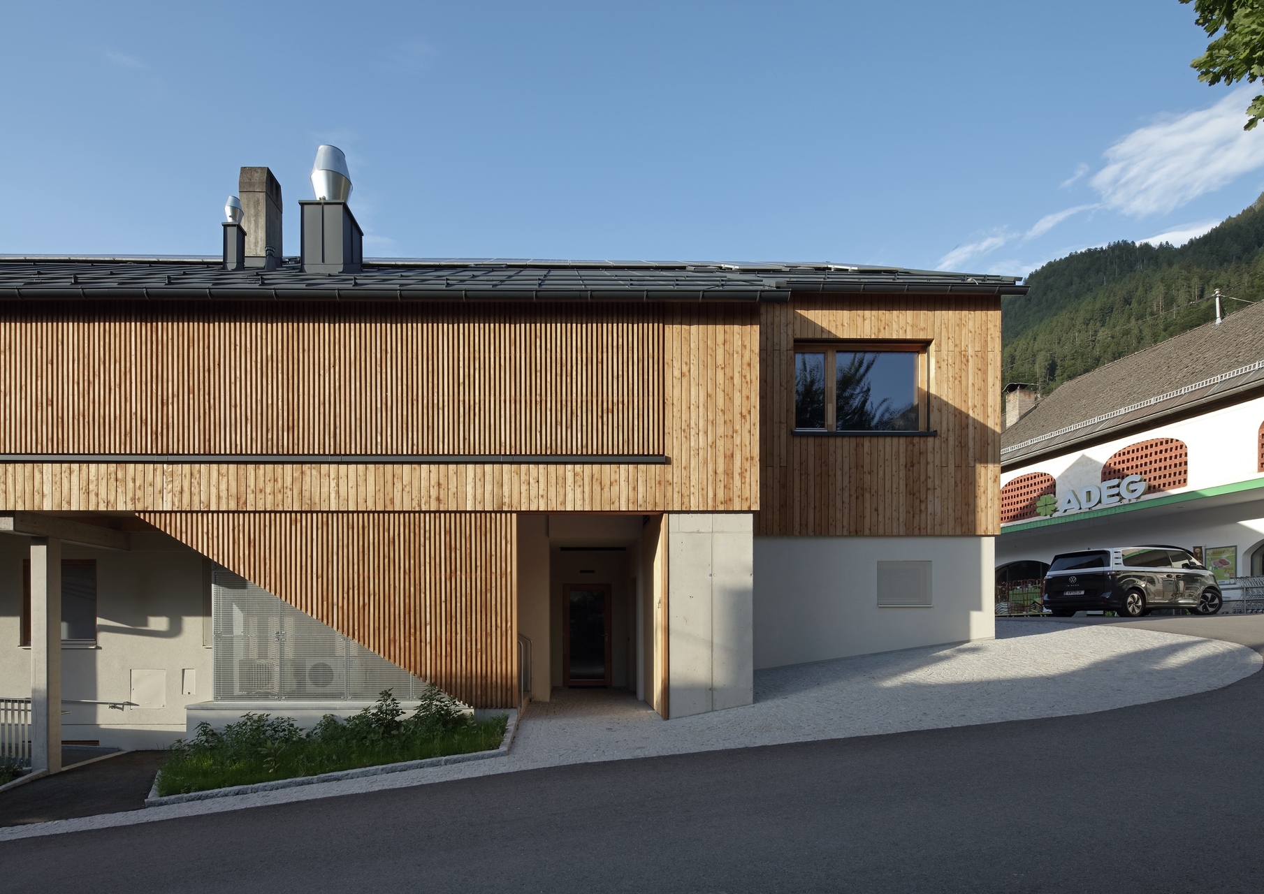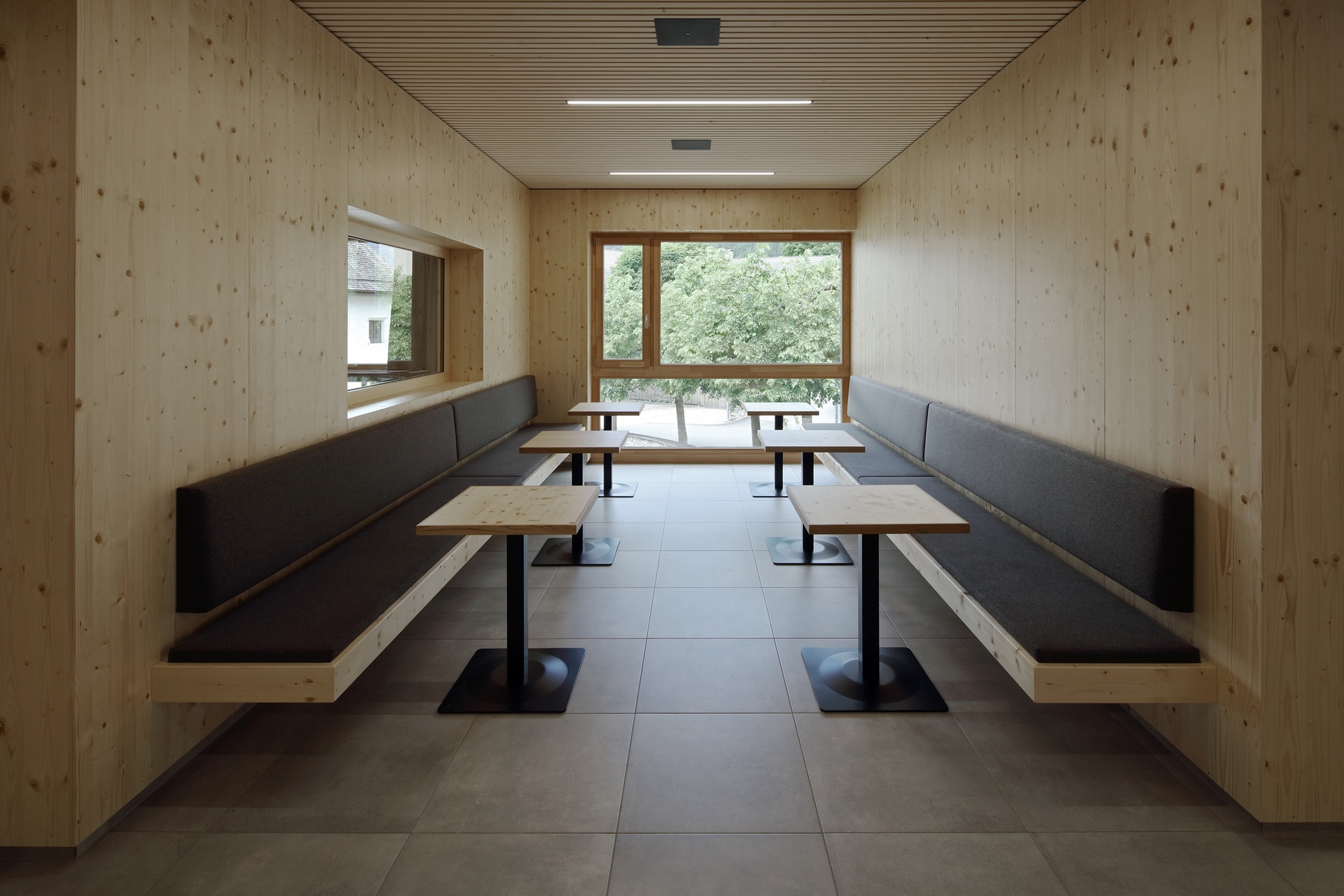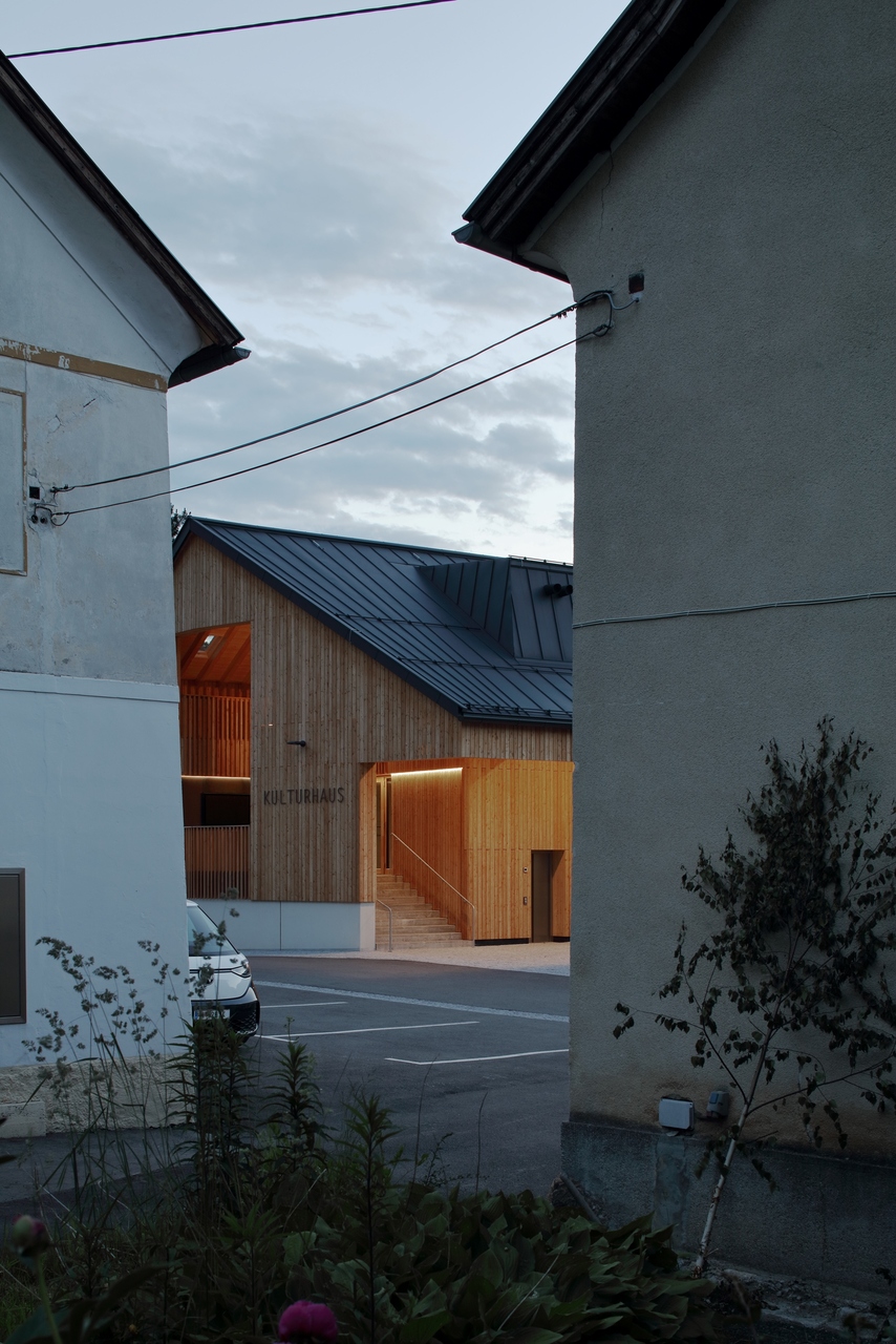 Ein offenes, kaltes Foyer ist den eigentlichen Räumlichkeiten vorgelagert und agiert als erweiterter Innenraum und Treffpunkt. Eine große Öffnung offeriert viel Licht und eine schöne Sicht- und Kommunikationsbeziehung zum oberen Platz´l und zum Nahversorger.