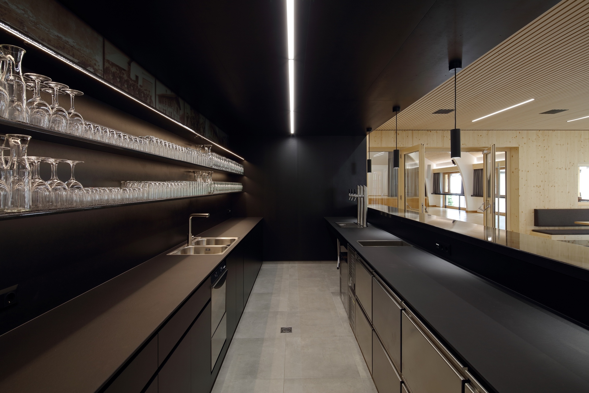 Das alle Nutzungen verbindende innere Foyer ermöglicht über seine zentrale Anordnung und minimalen Raumbedarf eine klare Orientierung und optimalen Vernetzung innerhalb des Hauses. Die Küche wird an den Ausschank angedockt und befindet sich auf Saalniveau. Die räumliche Anordnung und ein eigener Zugang lassen eine einfache Anlieferung (mittels Aufzug) und einen guten Arbeitsablauf erwarten. Speisen können über einen separaten Bereich in den Saal serviert werden, ohne den Ausschank zu kreuzen. Die Wege zu den Kühlzellen sind auf ein Minimum reduziert.