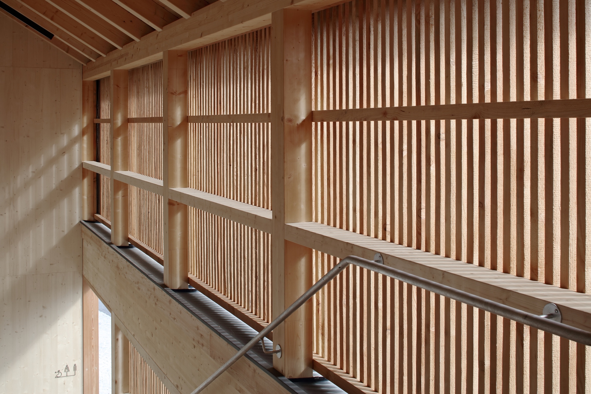 Die innenräumliche Funktionsanordnung folgt einer einfachen Organisation. Der Zugang erfolgt über den gedeckten wettergeschützten Bereich mittels Freitreppe zum Saal. Beeinträchtigte Personen können - fast an gleicher Stelle - den Aufzug benutzen.