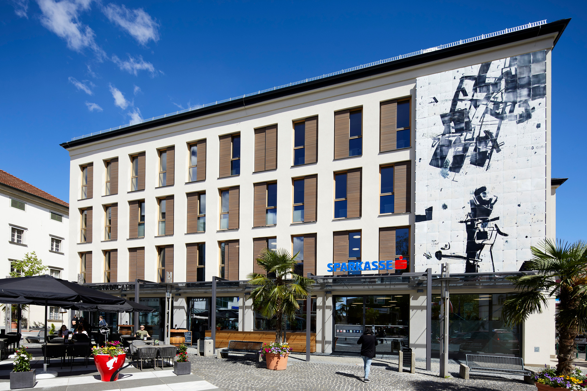 Sonnenschutzläden mit Holzlamellen bilden die Fassade prägende Elemente, in unterschiedliche Positionen verschiebbar, bringen sie Leben in die strenge Grundstruktur.