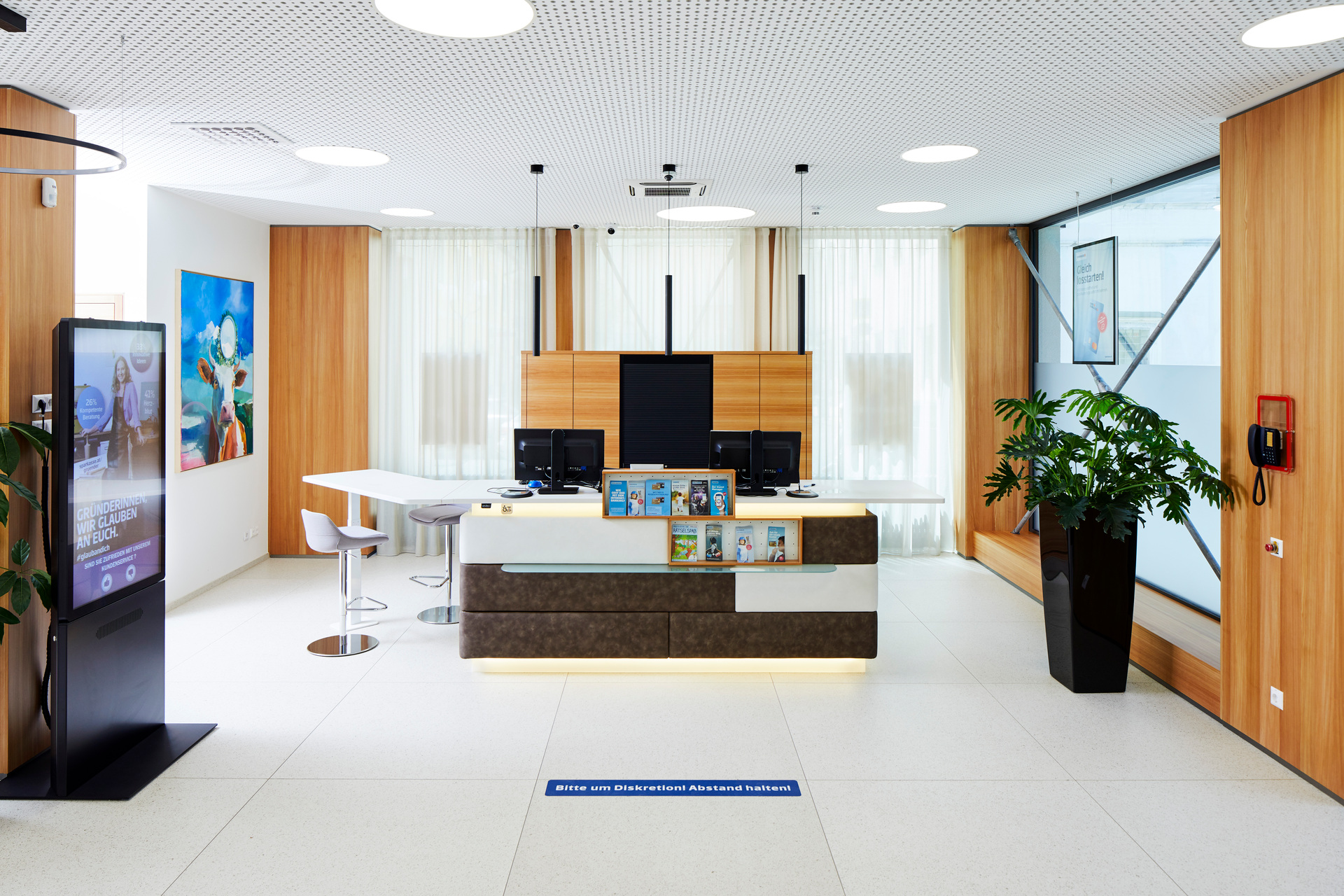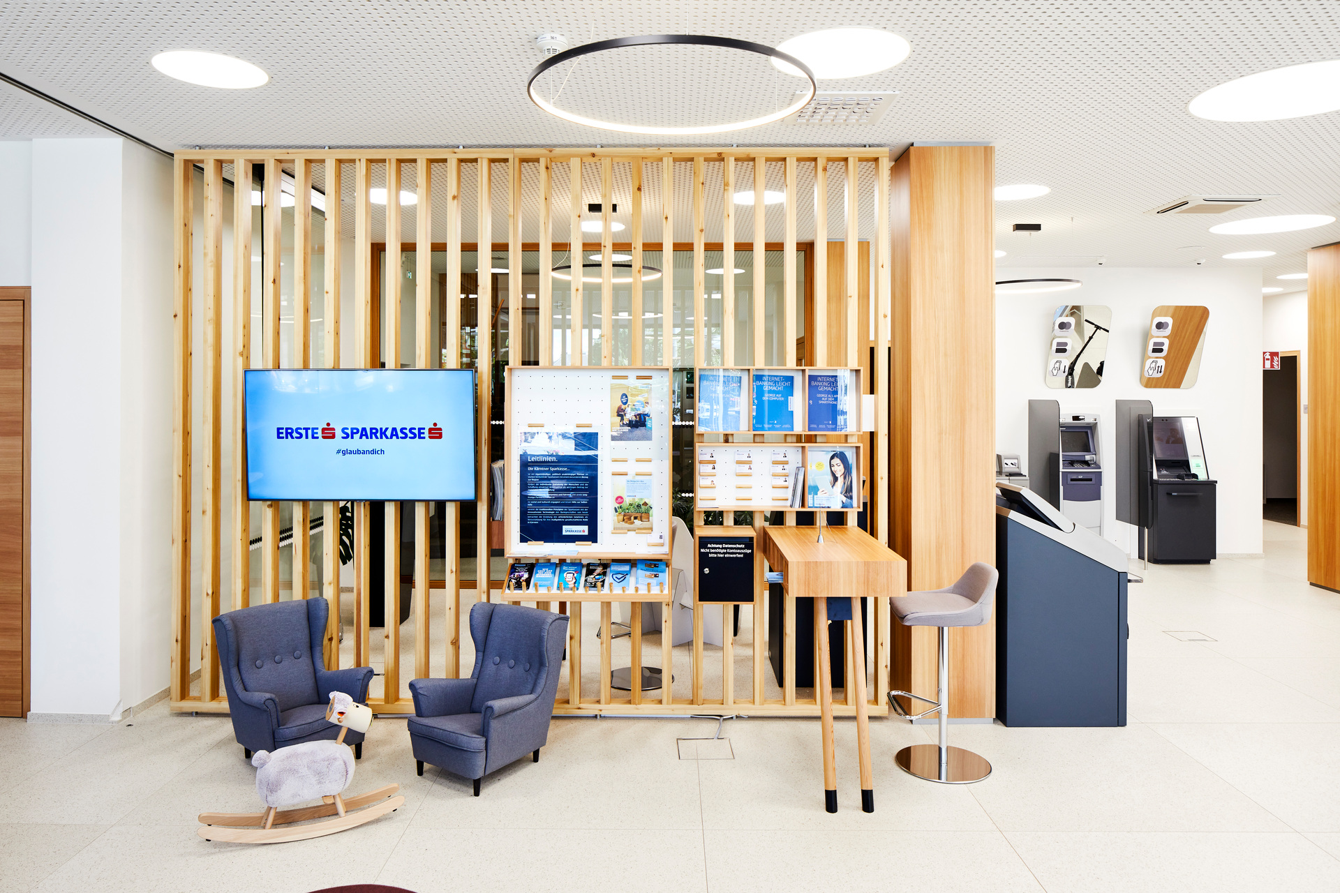 Dem Kunden öffnet sich ein großzügiger und übersichtlicher Raum mit gut sichtbarem Empfangsschalter und einladendem Loungebereich. Eine hölzerne Sitztribüne wird in die Fassade integriert, bildet den Übergang zum angeschlossenen Café und ist auch von außen als Sitzbank nutzbar. Kinderspieleck und gepolsterte Stühle schaffen einen gemütlichen Warte- und Aufenthaltsbereich. Geldautomaten und Kontoauszugsautomaten sind leicht zugänglich positioniert. Eine begrünte Wand und individuelle Möbel schaffen Raumqualität. Der Schalter ist offen angeordnet, und überschaut das gesamte Foyer, die Kunden werden in Empfang genommen und verteilt. Hinter dem Schalter sind drei Beratungsräume angeordnet. Sie verfügen über verglaste Eingangsbereiche, um auch von hier einen Überblick auf die Schalterhalle zu gewährleisten. Außerhalb der Öffnungszeiten wird das Obergeschoss und das Café mit einer Glasschiebewand abgetrennt.