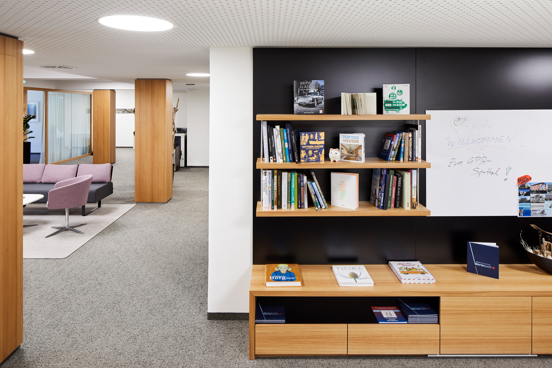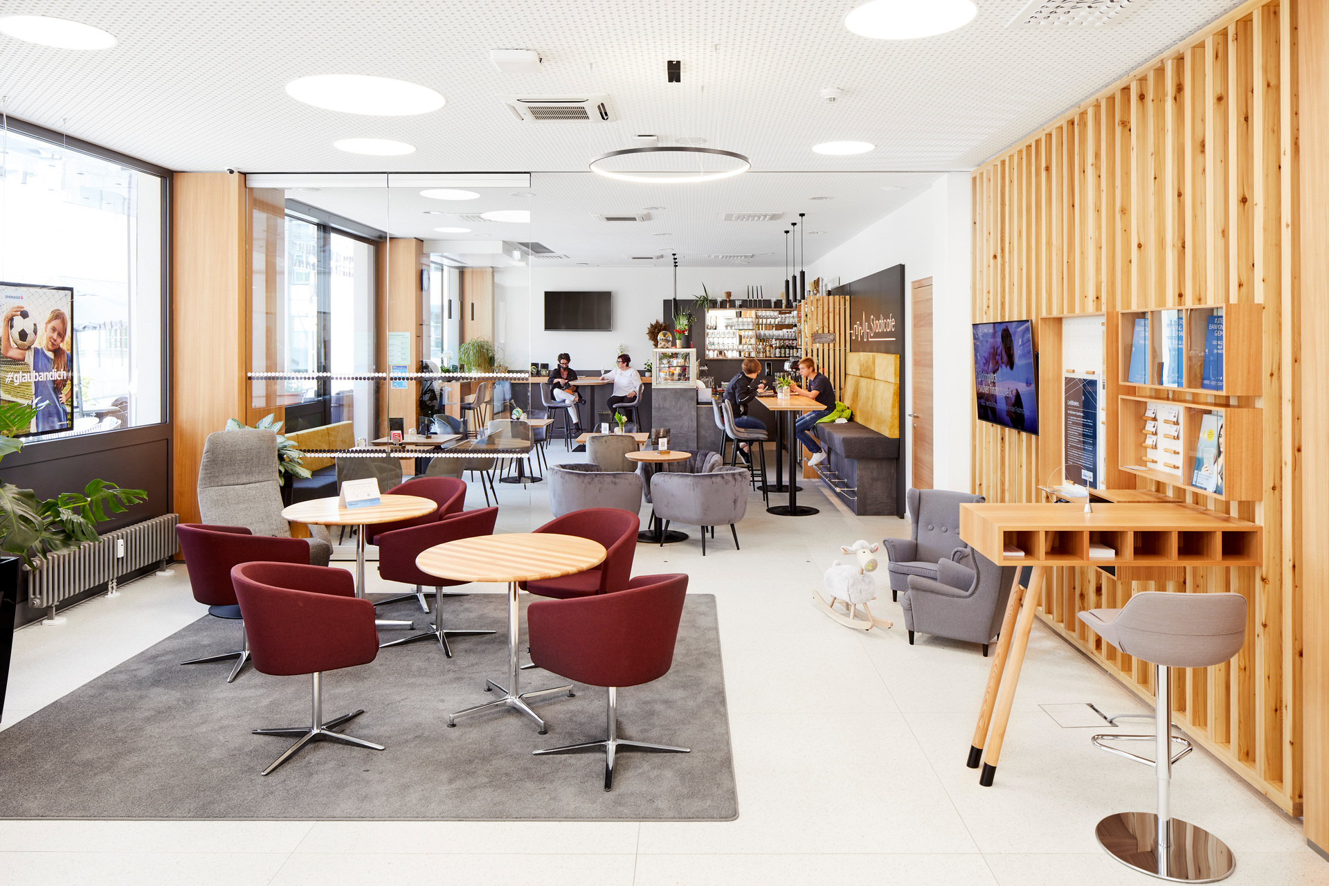 Der zentrale Raum ist einerseits mit Loungemöbeln und Infobereichen für Besucher ausgestattet, andererseits können hier auch kleine Mitarbeitermeetings stattfinden.