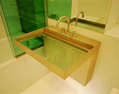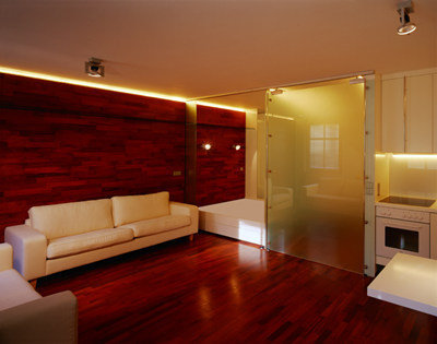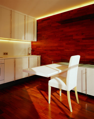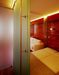 Besonderes Augenmerk wurde auch auf die verwendeten Materialien gelegt. Der Bodenbelag als auch die Wandverkleidung sind aus versiegeltem Meerbaum. Im Badezimmer wurde ein mit weißem Epoxy-Harz beschichteter Estrich verlegt, ein Bodenbelag der üblicherweise im Industriebereich seine Verwendung findet. Die Wände sind mit weiß beschichtetem Floatglas verkleidet. Die vollkommen in weiß gehaltene Einrichtung bildet einen markanten Kontrast zum dunklem Holz der Wände und des Bodens. Unterstützt wird dies durch die sehr effektvoll eingesetzte Beleuchtung, bestehend aus Vinestra Linien-Leuchten und Deckenspots zur punktuellen Akzentuierung der Stimmung. (02.04.2001)