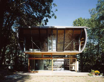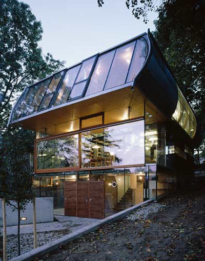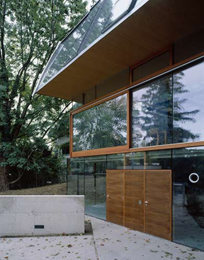 Rein konstruktiv betrachtet ist das Haus schon kühn genug: Zwei massive Betonscheiben stützen eine an Herausforderung grenzende Stahlbrückenkonstruktion, die das oberste Geschoß samt Dach bildet und mittels Stahlfachwerk mit Holz- und Glasausfachung in Form hält. Rundherum ist alles gläsern - teils schwarz und blickdicht, meist aber transparent offen, weil man jeden Sonnenstrahl in die Wohnung hineinholen wollte. Diese Transparenz zieht sich über die Glaswände hinauf bis über das Dach. Denn auch das ist streifenweise verglast, der Specht kann hier herein-, die Bewohner in die Baumkronen hinauslugen. Die Raumwirkung der nach außen gebogenen Glasröhre ist gewaltig. Damit im Sommer das kühle Waldlüfterl Einzug halten kann, lässt sich der hölzerne Teil der Konstruktion mittels elektrischen Antriebs aufschieben. Es entsteht dann ein riesiges Atrium mit Vogelsang und Spechtgetrommel frei Haus.