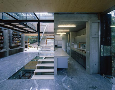 Driendl beweist mit seinen Arbeiten stets ein fast unheimliches Gefühl für Licht- und Raumsituationen, für präzise Planung jeder noch so kleinen und scheinbar unbedeutenden Ecke, offenbar hat der Mann das richtige G'spür für konstruktive Intelligenz und unkonventionelle Materialeinsätze. Nur ein paar Beispiele: Um das Haus quasi bis zum Untergeschoßfußboden mit Licht fluten zu können, sind in den Decken an wichtigen Stellen ebenfalls Gläser eingelassen. Ein durchlässiger Holzraster in der Decke sorgt für akustische Kommunikation zwischen den oben und unten gelegenen Wohnzonen sowie für eine gute Durchlüftung.