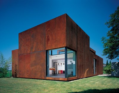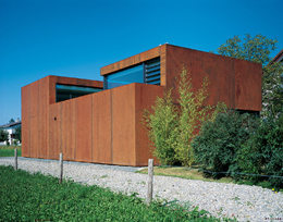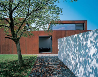 Die Kubatur entwickelt auf rechteckigem Grundriss drei jeweils höhengestaffelte und flachgedeckte Einheiten, die dank dazwischen gesetzter Verglasungen Tageslicht aus allen Himmelsrichtungen empfangen, während die Gebäudehülle aus grossformatigen korrodierten Stahltafeln einen eher hermetischen Eindruck vermittelt. Raumhöhen zwischen 2,30 m und 4,20 m schaffen die idealen Voraussetzungen für die unterschiedliche Ateliernutzung, eine neue Betonwand trennt den strassenseitigen Parkplatz von einem geschützten Innenhof zwischen Alt- und Neubau. (Text: Gabriele Kaiser, 11.02.2002)