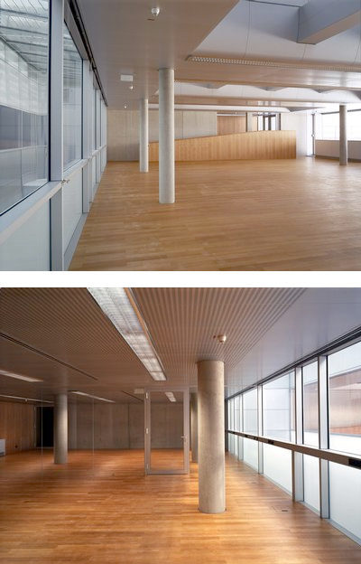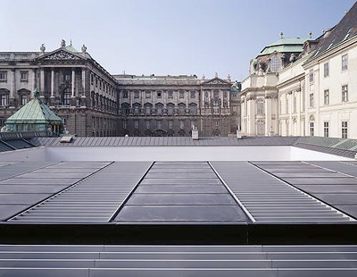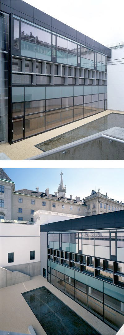 Die diffizile Aufgabe, in einem nahezu unantastbaren Bereich zwischen Augustinerstrasse, Burggarten und Hofburg einen Neubau zu errichten, ist den Architekten mit diziplinierter Zurückhaltung und einer Art nüchternen Versenkung der Phantasie in die Zwecke bestens geglückt. Das gläserne, nur mit zwei Fassaden in Erscheinung tretende Studiengebäude hat eine Raumtiefe von rund 30 Metern, über den eingeschobenen Lichthof ist sogar die „unterirdische“ Bibliothek natürlich belichtet. Materialien wie Sichtbeton, dunkles Fliesterrazzo, Aluminium und Glas in unterschiedlichen Transluzenzwerten sowie Eichenparkett sorgen für eine Atmosphäre funktionaler Klarheit im historisch vielschichtigen Baugefüge.